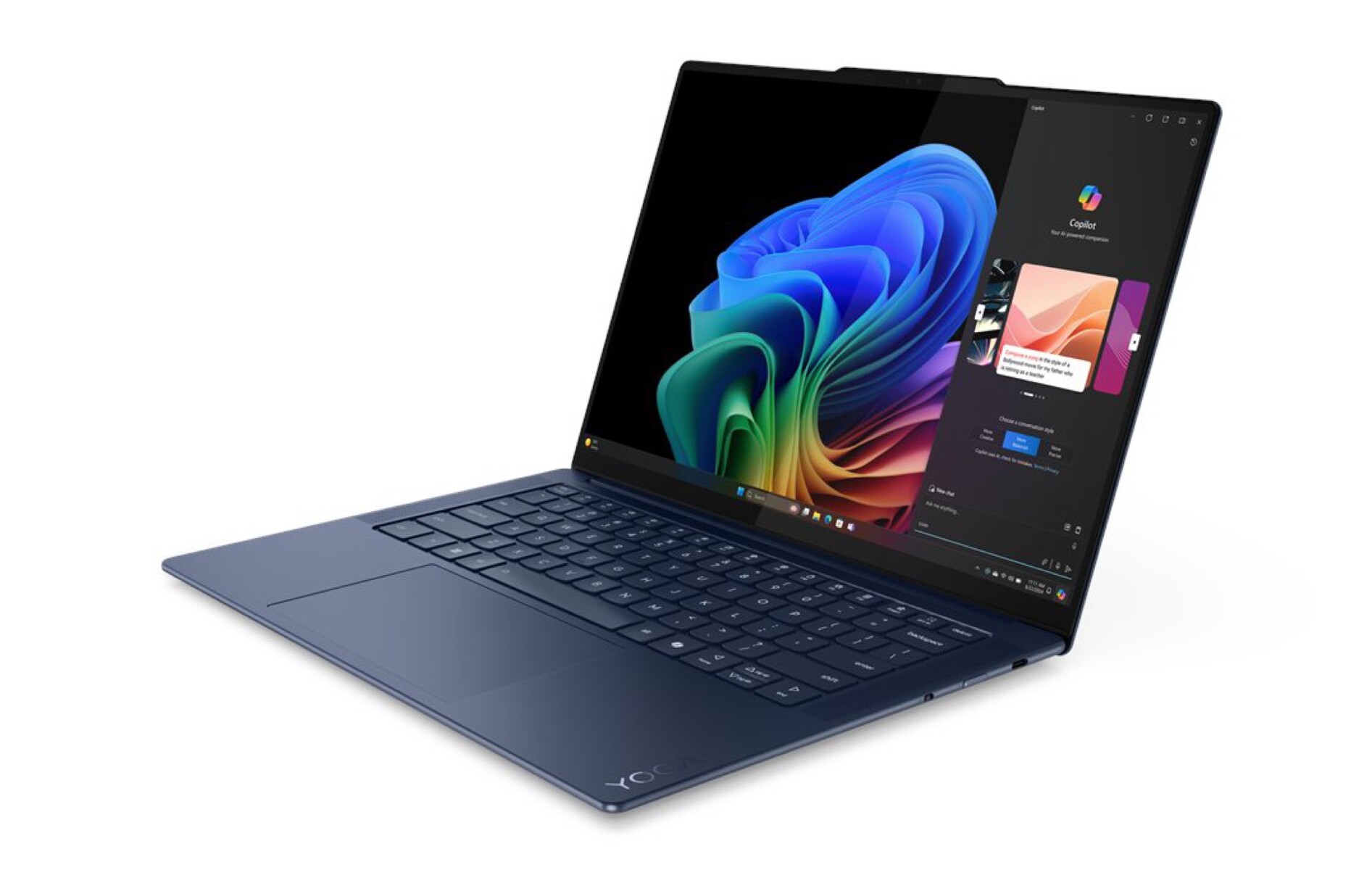 Dabei handelt es sich um eine neue Version des Yoga Slim 7 14, welches das Design des älteren Yoga Slim 7 Pro (ca. 1.000 Euro auf Amazon) mit nur wenigen Anpassungen übernimmt. Lenovo setzt auf ein Gehäuse in Blau mit Lautsprecher-Gittern links und rechts von der Tastatur, einem großen Multitouch-Trackpad und einer kleinen Ausbuchtung am oberen Bildschirmrand, welche die Webcam beherbergt. Lenovo verbaut wie auch beim AMD-Modell insgesamt drei USB-C-Anschlüsse sowie einen 3,5 mm Kopfhöreranschluss.