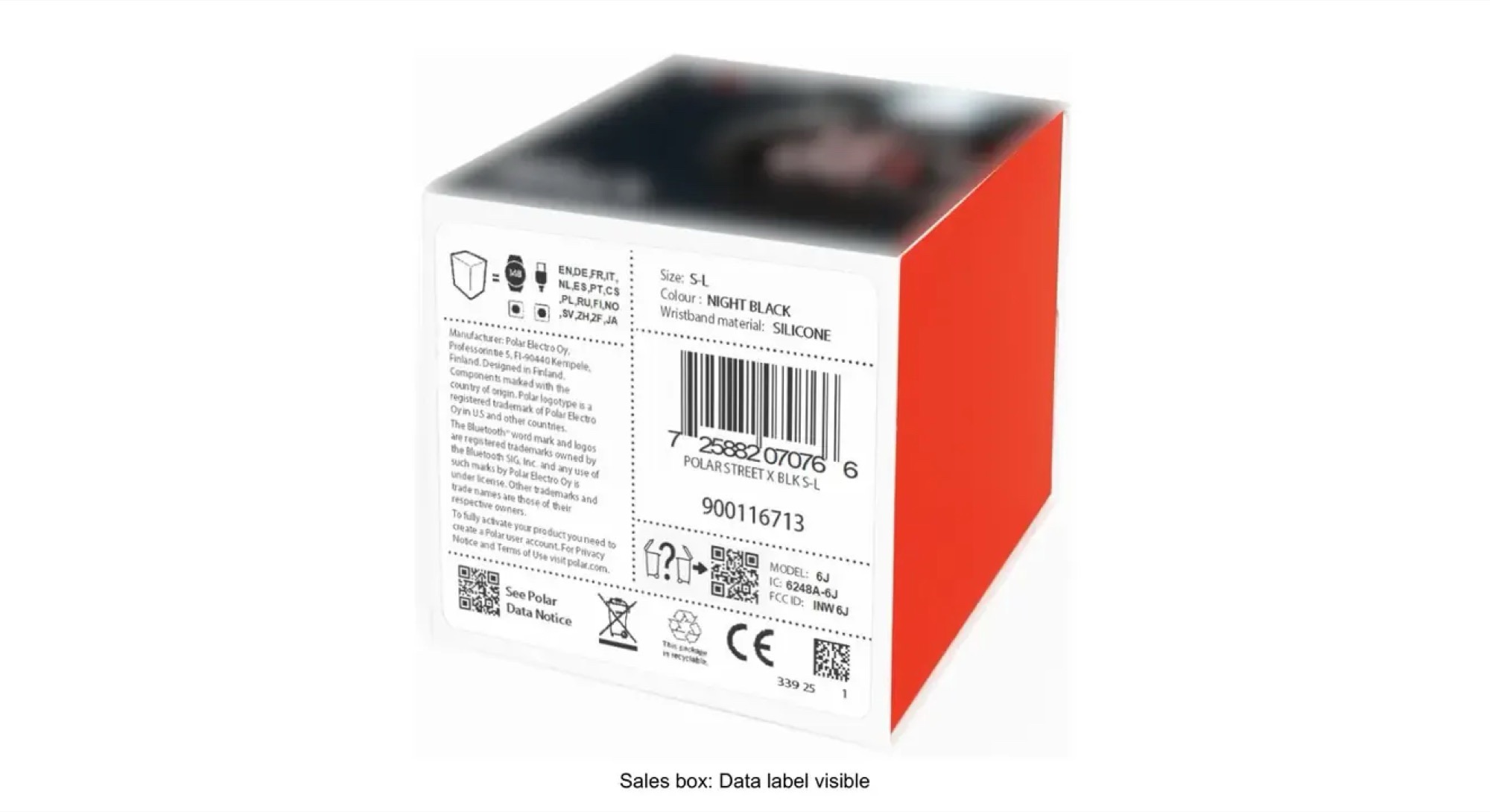 Die Unterseite der Verpackung bestätigt, dass eine Version der Polar Street X in der Farbe "Night Black" ausgeführt wird. Im Lieferumfang befinden sich neben der Smartwatch auch ein USB-Ladekabel und ein Silikon-Armband. Die Verpackung bestätigt, dass die Benutzeroberfläche der Smartwatch in zahlreichen Sprachen verfügbar ist, darunter auch Deutsch, weshalb davon auszugehen ist, dass die Uhr auch in Deutschland und Österreich auf den Markt kommen wird.