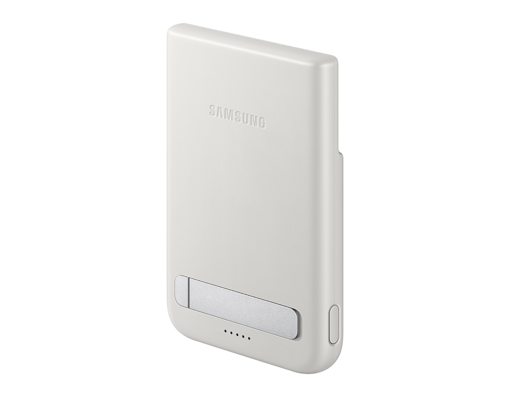 Die Power Bank von Samsung setzt auf ein eher ungewöhnliches Design, denn der Bereich rund um die obere Hälfte der Qi2-Magnete wird ausgespart – das ist möglicherweise notwendig, um Platz für das Kameramodul zu schaffen. Die Power Bank bietet darüber hinaus einen ausklappbaren Standfuß, der das Smartphone sowohl im Hochformat als auch im Querformat halten können dürfte.