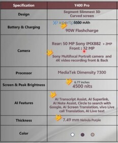 Angeblich können sowohl die Frontkamera als auch die Hauptkamera 4K-Videos aufzeichnen. Das 6,77 Zoll AMOLED-Display erreicht nur noch eine HDR-Spitzenhelligkeit von 4.500 Nits, und ist damit 10 Prozent weniger hell als das Panel des Y300 Pro. Dafür setzt das neue Modell auf den moderneren MediaTek Dimensity 7300, der allerdings nur 6 Prozent schneller ist als der Snapdragon 6 Gen 1 des Vorgängermodells. Das Smartphone soll mit 8 GB Arbeitsspeicher und wahlweise mit 128 GB oder 256 GB Flash-Speicher in den Farben Weiß, Gold und Violett auf den Markt kommen, das Launch-Datum ist aber noch nicht bekannt.