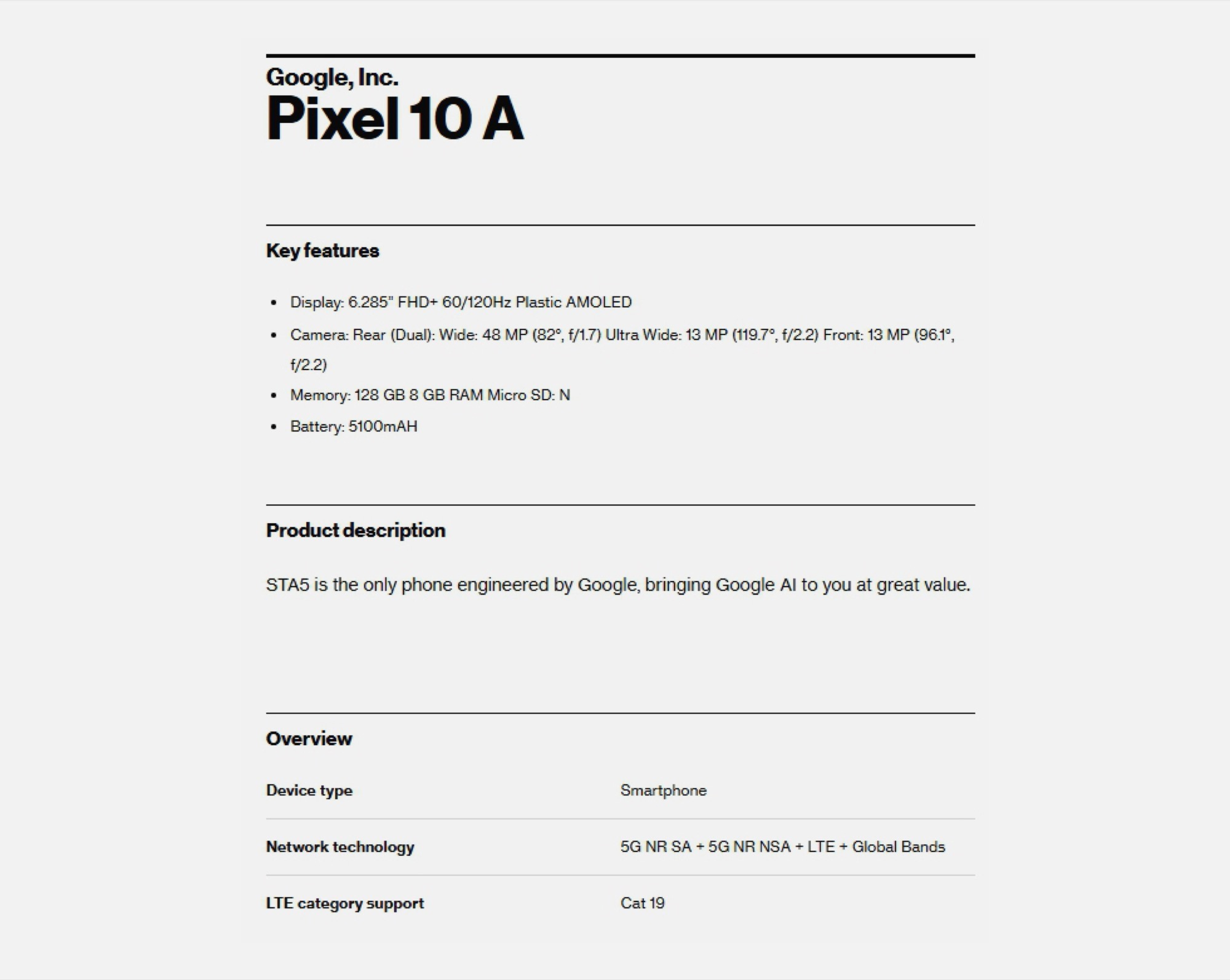 Dieser Leak bestätigt frühere Gerüchte, laut denen das Pixel 10a kaum Hardware-Upgrades erhalten wird. Google soll wie gehabt ein 6,3 Zoll P-OLED-Display verbauen, das 1.080p+-Auflösung erzielt. Die Bildfrequenz des Panels kann nur auf 60 Hz oder 120 Hz eingestellt werden, statt wie bei LTPO-AMOLED-Panels dynamisch an den Bildschirminhalt angepasst zu werden, um Strom zu sparen. Das Display könnte allerdings etwas heller werden. Google soll wie gehabt eine 13 Megapixel Selfie-Kamera, eine 48 MP f/1.7 Hauptkamera und eine 13 MP f/2.2 Ultraweitwinkel-Kamera verbauen.