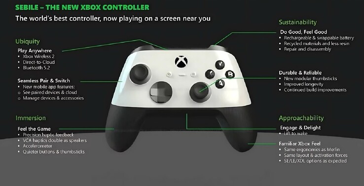 Microsoft soll endlich einen Akku verbauen, statt wie beim aktuellen Xbix-Controller ein Batteriefach, sodass das Gamepad bequem über USB-C aufgeladen werden kann. Ein effektiverer Standby-Modus, der automatisch beendet wird, wenn der Controller bewegt wird, könnte die Akkulaufzeit verlängern. Wird ein Spiel über Xbox Cloud Gaming gestreamt, soll "Sebile" eine direkte Verbindung zum WLAN-Router herstellen, statt zur Konsole, um die Eingabe-Latenz zu reduzieren – diese Idee kennt man bereits vom Google Stadia Controller. Einstellungen des Controllers sollen bequem über eine Smartphone-App angepasst werden können. Derzeit ist unklar, wann Microsofts Xbox-Controller der nächsten Generation auf den Markt kommen wird.