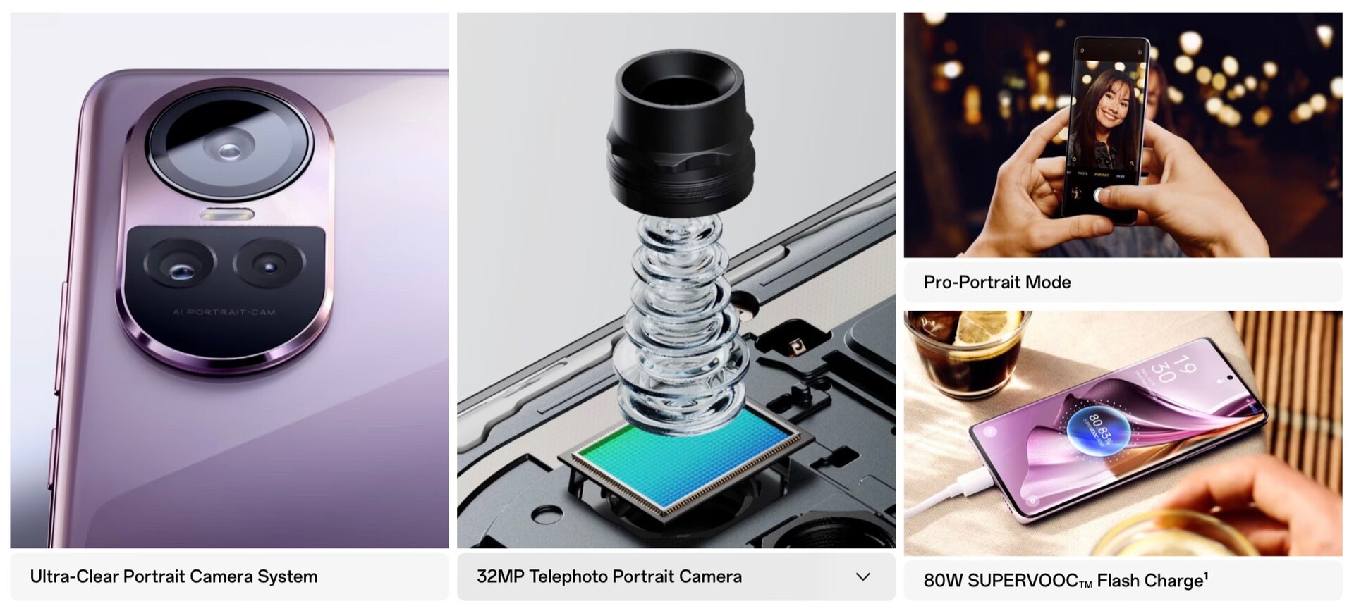 Das Reno10 und das Reno10 Pro setzen auf praktisch dasselbe Design, und teilen sich auch weite Teile der Ausstattung, angeführt von einem 6,7 Zoll großen, 120 Hz schnellen 1.080p+-AMOLED-Display mit einer Spitzenhelligkeit von 950 Nits. Beide Geräte besitzen eine 32 MP f/2.4 Selfie-Kamera, die aber nur beim Pro-Modell Autofokus unterstützt. Das Reno10 besitzt eine 64 MP f/1.7 Hauptkamera, das Reno10 Pro eine 50 MP f/1.8 Hauptkamera mit OIS.