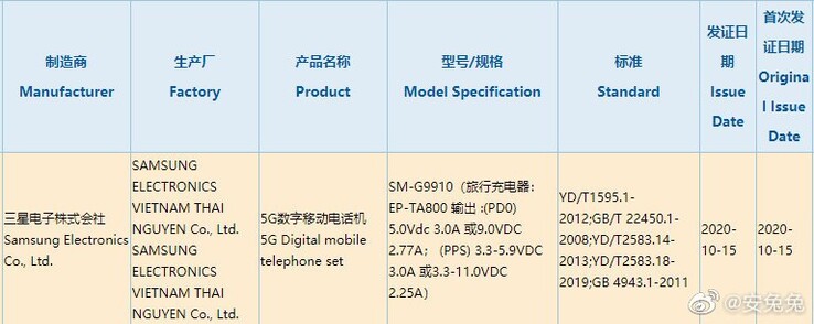 Konkret entdeckt wurden Hinweise auf ein neues Samsung-Smartphone mit der Modellnummer SM-G9910, welches bei der chinesischen 3C-Behörde zur Zertifizierung vorstellig wurde. Beobachter gehen davon aus, dass es sich hierbei um das reguläre Galaxy S21 handelt, das hier mit 25 Watt Netzteil zertifiziert wurde. Ice Universe zufolge könnte das Ultra-Modell zumindest 45 Watt schnelles Laden ermöglichen, mehr als das ist 2021 aber nicht von Samsung zu erwarten, zumindest nicht bei der Galaxy S21-Familie.