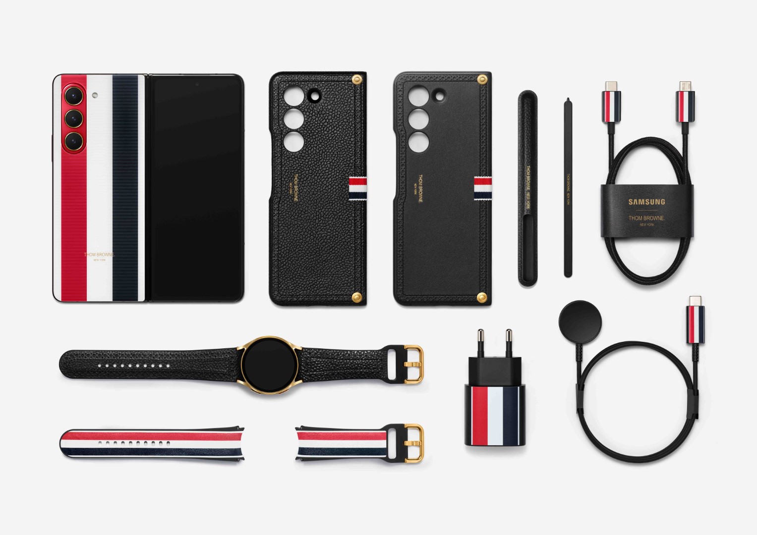 Im Gesamtpaket inkludiert ist die Galaxy Watch 6 mit zwei Lederarmbändern, einem schwarzen sowie einem in den ikonischen Thom Browne Farben Rot, Weiß und Blau. Die findet man übrigens auch beim Zubehör, etwa dem 25 Watt Netzteil, dem Uhrenladegerät sowie dem stoffumhüllten USB-C-Kabel - dort allerdings nur an den Steckern, wie die Bilder ganz unten zeigen. Das Zubehör inkludiert zudem eine Lederhülle für das aktuelle Samsung Foldable sowie einen S-Pen mit Thom Browne Schriftzug.