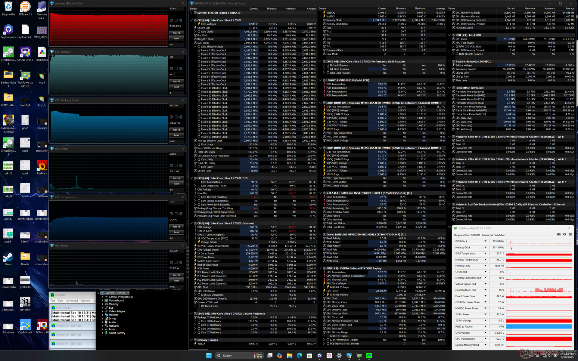 Die CPU stieg beim Starten von Prime95 Stress auf 4,2 GHz und 204 W an, bevor sie schnell abfällt und sich bei 4 GHz und 171 W stabilisiert, um eine Kerntemperatur von 96 °C aufrechtzuerhalten. Das Temperaturplateau ist hoch und deutet darauf hin, dass der Core Ultra 9 275HX an die Grenzen des Legion 9 18 stößt, um hohe Boost-Taktraten aufrechtzuerhalten.