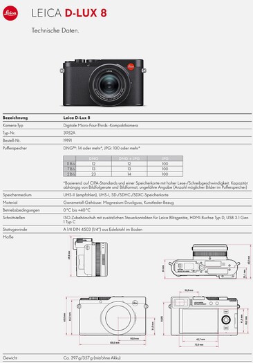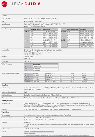 Die Leica D-Lux 8 wurde bereits Mitte Mai angekündigt, damals hatte Leica allerdings nur einen Überblick über die Neuerungen veröffentlicht. Endlich steht das Datenblatt zur Verfügung, und bestätigt nähere Details zu einigen der Verbesserungen, rechtzeitig zum Verkaufsstart.