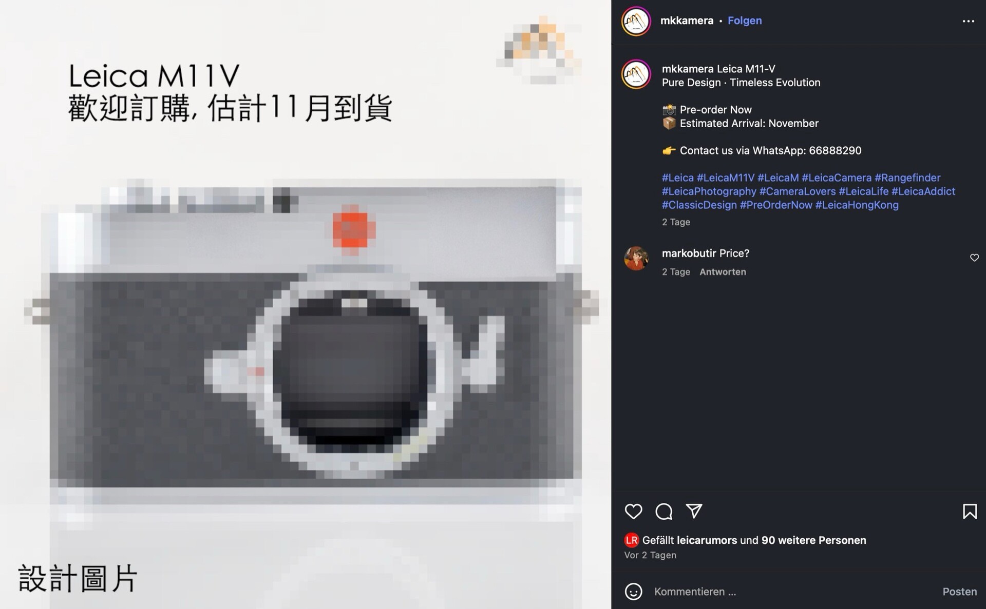 Schon seit Monaten kursieren Gerüchte, laut denen Leica noch vor Ende des Jahres eine neue Variante der Leica M11 auf den Markt bringen wird, die den Messsucher durch einen elektronischen Sucher ersetzt. Der chinesische Onlineshop M&K Kamera hat auf Instagram nun einen ersten, verpixelten Screenshot veröffentlicht, der offenbar einen Teil der Produktseite der Leica M11-V zeigt.