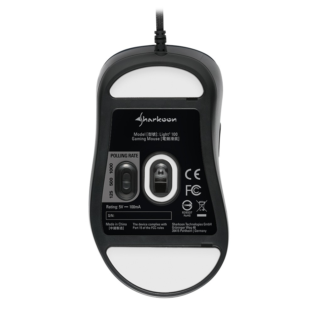 Die Verarbeitung an sich lässt keine Wünsche offen, ein samt-mattes schwarzes Plastik dient als Oberfläche. Fingerabdrücke sind nach den wenigen Stunden Spielzeit keine zu sehen. Die Maus, übrigens für Rechtshänder, besitzt ein klickbares beleuchtetes Mausrad, zwei Daumentasten, die rechte und linke Maustaste, und vor dem Rad noch eine kleine DPI-Wahltaste, mit dem durch sieben verschiedene Auflösungen durchgeklickt werden kann. Farbig beleuchtet ist ebenfalls das “L2”-Logo am Maus-Gehäuse und ein kleiner Lichtstreifen an der unteren Hinterkante. An der Unterseite ist ein weiterer Schalter mit drei Stellungen für die Polling-Rate zu finden. Auswählbar ist die Abfragerate der Mausposition entweder mit 125, 500 oder 1000 Hz.