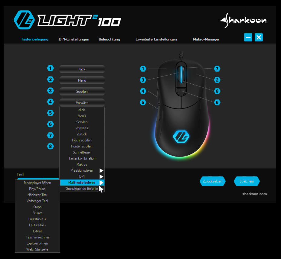 Selbstverständlich gibt es dazu auch eine Software von Sharkoon, mit der alle Tasten belegt und weitere Einstellungen vorgenommen werden können. Hier merkt man einmal mehr, dass die Light² 100 für Gamer gedacht ist. Nicht nur aufgrund der anpassbaren RGB-Beleuchtung, sondern wegen der verfügbaren Spezial-Optionen, wie beispielsweise “Präzisionszielen”, bei der kurzzeitig die DPI erhöht wird - nützlich beim Snipern durchs Zielfernrohr. Aber auch an Standard-Befehle für den Mediaplayer wie Play/Stop, nächster/vorheriger Titel oder Lautstärke hat Sharkoon gedacht.