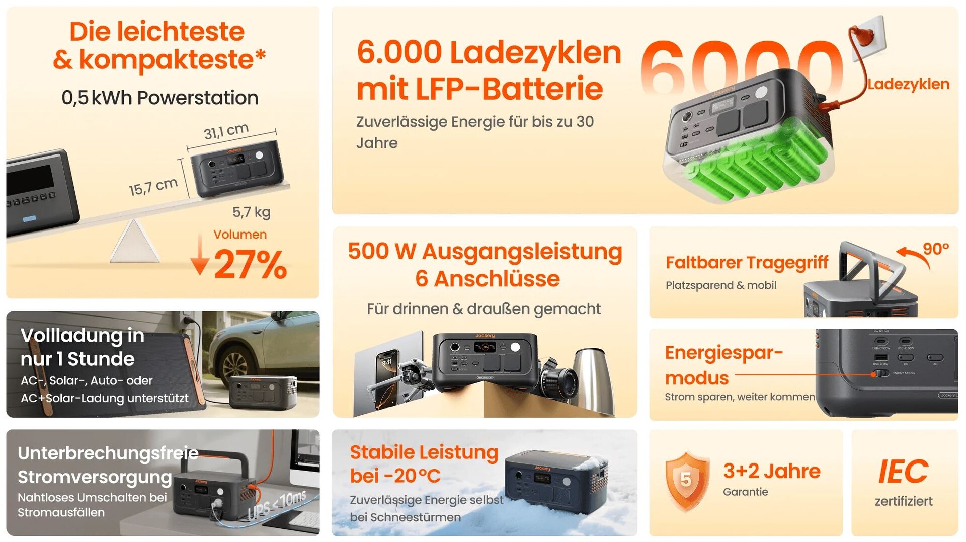 Statt der unverbindlichen Preisempfehlung in Höhe von 499 Euro kostet die Jackery Explorer 500 v2 anfangs nur 319 Euro, also satte 180 Euro bzw. 36 Prozent weniger. Zudem legt der Hersteller als Geschenk noch ein 5 m langes DC-Solarpanel-Verlängerungskabel zum mobilen Laden als Geschenk bei.