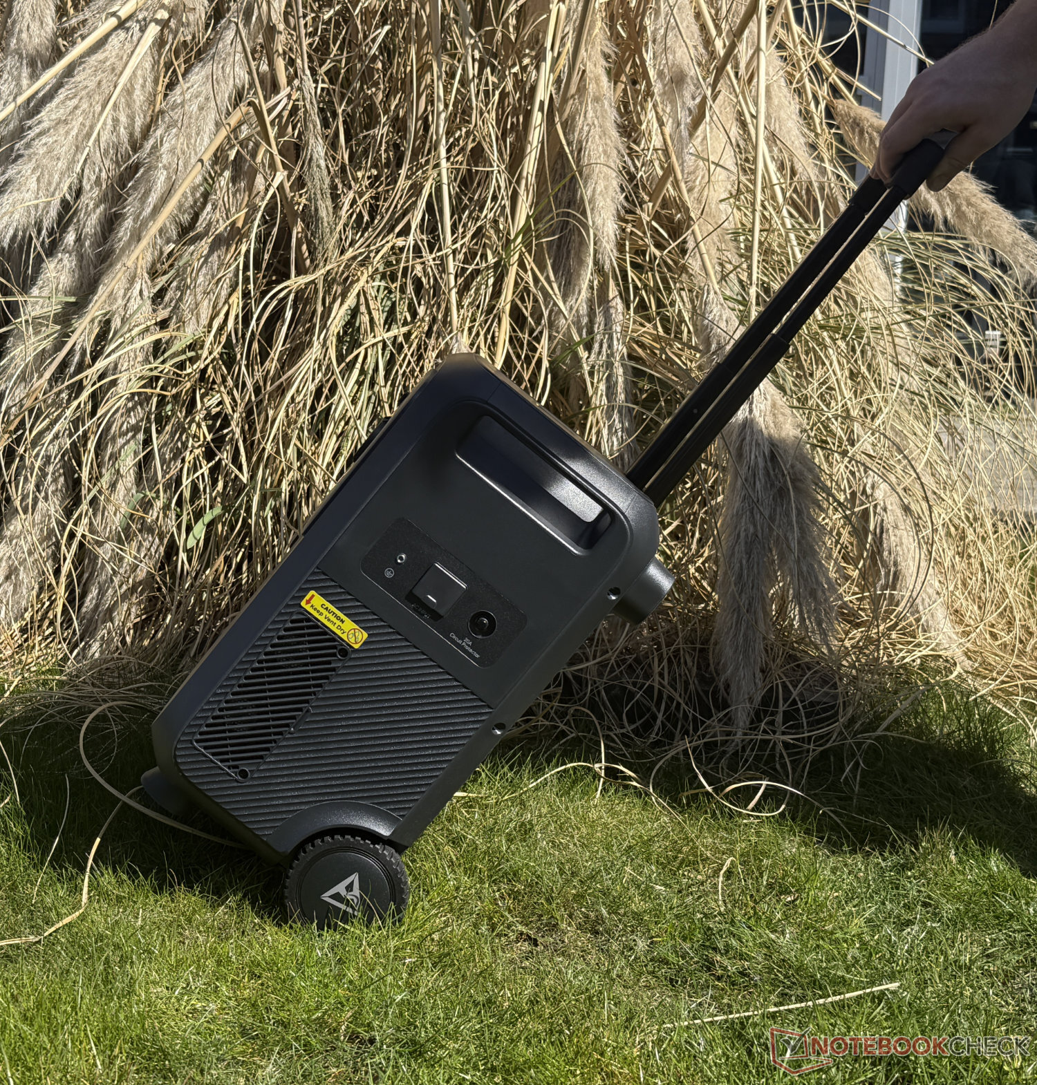 Mit ihrem Gewicht von rund 39 kg würde sie zwar bei keiner Airline als Handgepäck durchgehen, präsentiert sich aber dennoch deutlich kompakter und leichter als viele Wettbewerber mit vergleichbarer Kapazität. So wiegt beispielsweise die EcoFlow Delta Pro 3 (ca. 3.300 Euro bei EcoFlow) gut 10 kg mehr. Die Elite 400 ist sogar leichter als die knapp 1 kWh weniger fassende Anker Solix F3000 (ca. 2.000 Euro bei Anker Solix). Für den Transport sind, wie in dieser Klasse üblich, zwei Räder an der Unterseite sowie ein Teleskopgriff und zwei stabile Griffe an der Oberseite untergebracht.