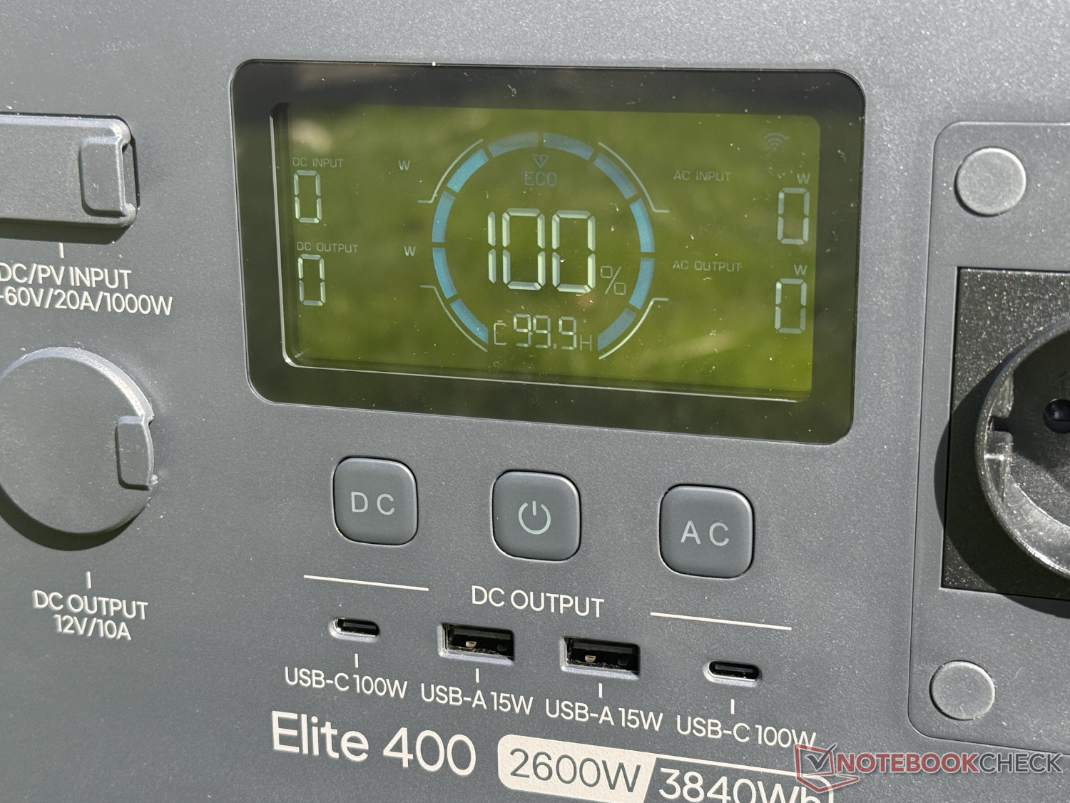 Neben den zwei Steckdosen sind zudem je zweimal USB-A (max. 15 W) und zweimal USB-C (max. 100 W) sowie eine Kfz-Steckdose/Zigarettenanzünder-Anschluss mit 12 V und 120 W verbaut. Damit bietet die Elite 400 eine klassische Ausstattung ohne große Besonderheiten. Hier sind andere Modelle wie die kleinere Elite 300 mit einem DC-Anschluss mit 12 V und 30 A oder die Anker Solix F3000 mit einem dreipoligen CEE-Stecker mit 230 V und 16 A besser bestückt.