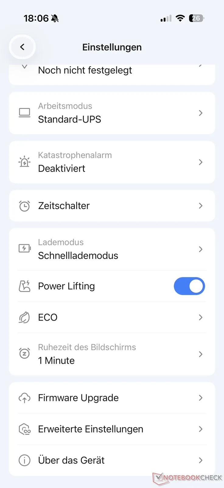 Nach der Einrichtung zeigt die App die aktuellen Energieflüsse und den Akkustand - genauso wie das Display an der Powerstation. Zusätzlich stehen eine Reihe von Basis-Einstellungen parat, beispielsweise zum Aktivieren des Power-Lifting- und des Schnelles-Laden-Modus. Zudem lassen sich Anpassungen der UPS-Funktion vornehmen, der sparsame ECO-Modus aktivieren oder Firmware-Updates (wenn verfügbar) installieren.