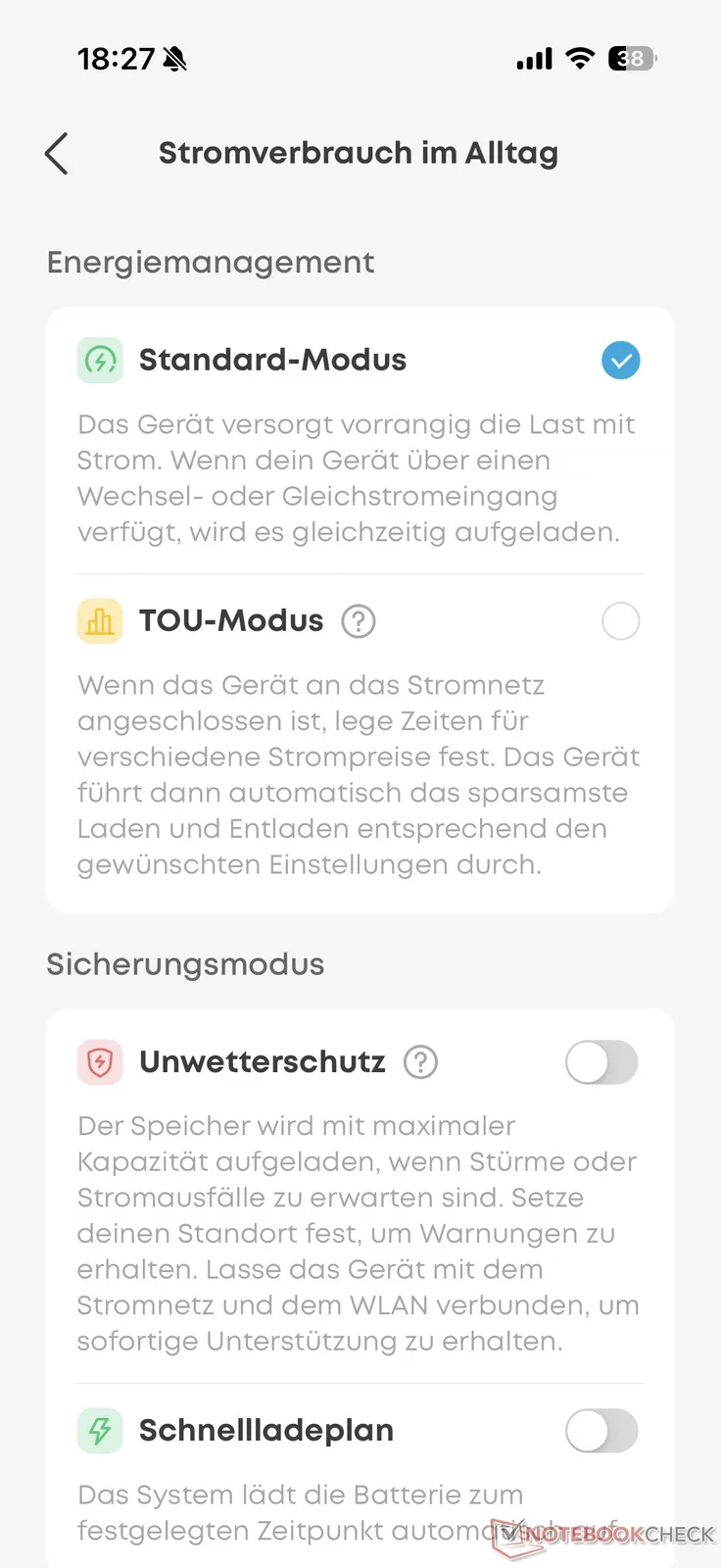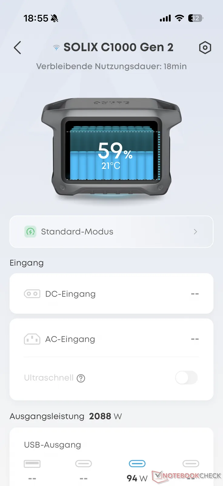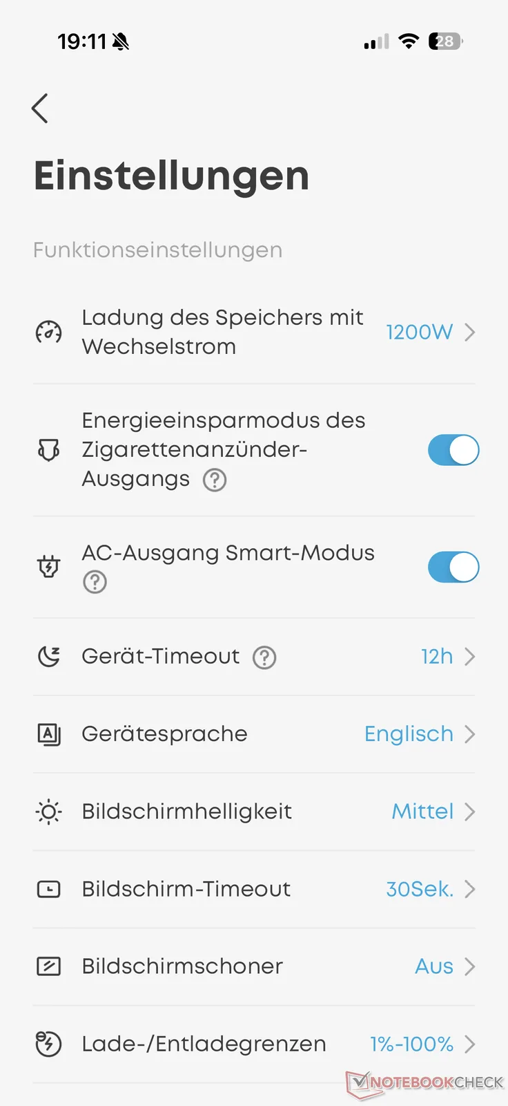 Außerdem informiert die App unter anderem über den Akkuladestand und die verbleibende Nutzungsdauer bei aktueller Ausgangsleistung sowie die Temperatur der Akkuzellen. Im Menü lassen sich dazu verschiedene Einstellungen zur maximalen Ladegeschwindigkeit, zum Energiesparen, zur Lade- und Entladegrenze und rund um das Display vornehmen. Auch Firmware-Updates sind hierüber möglich.