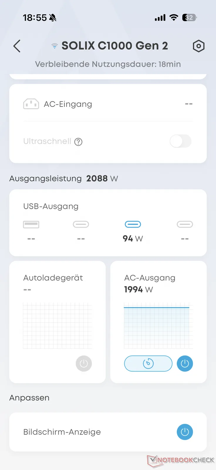 Die vom Hersteller angegebenen 49 Minuten Ladedauer beim AC-Laden haben wir im Test der Anker Solix C1000 Gen 2 nicht ganz erreicht - zumindest nicht ohne den Superschnell-Lademodus, der über die App aktiviert werden kann. Mit knapp 55 Minuten ist sie aber auch ohne Boost deutlich unter der Grenze von einer Stunde geblieben und lädt damit besonders zügig. Auffällig war, dass die Ladeleistung selbst kurz vor Schluss, also nahe der 100-Prozent-Marke noch bei rund 1.200 W lag. Hier bremsen andere Powerstations meist schon deutlich ein.