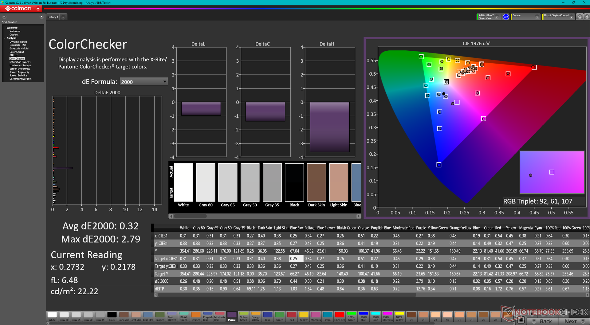 Das Display wird vorkalibriert geliefert ab Werk mit hervorragenden durchschnittlichen Graustufen- und Farb-DeltaE-Werten von nur 1,4 bzw. 1,13. Der Versuch, das Display mit unserem X-Rite-Kolorimeter noch weiter zu kalibrieren, verbessert die Graustufen- und Farb-DeltaE-Werte sogar auf jeweils nur <0,5. Dennoch ist eine Endbenutzerkalibrierung im Allgemeinen nicht erforderlich, wenn die DeltaE-Werte bereits <2 sind.