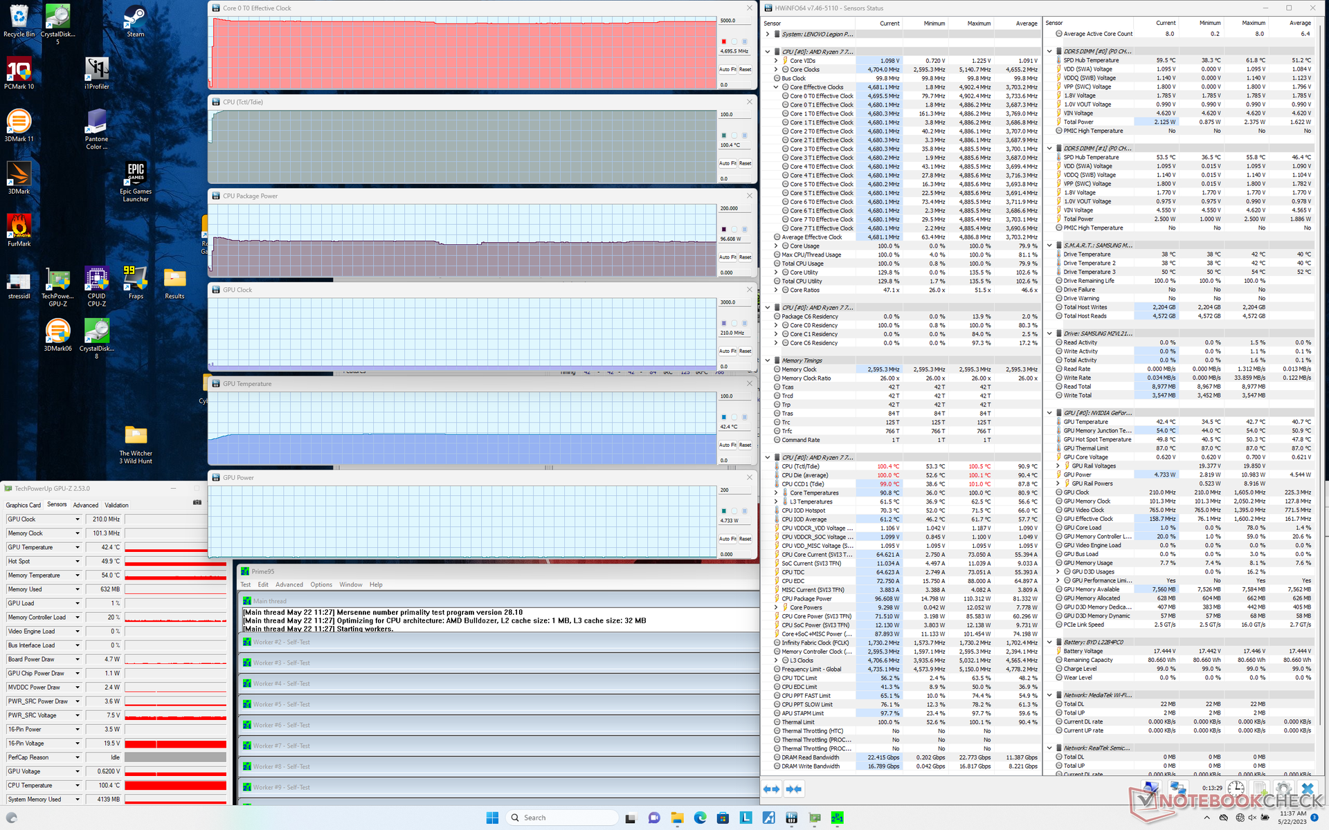 Bei der Ausführung von Prime95 auf Stress stiegen die Taktraten und die Leistungsaufnahme des Boards auf 4,9 GHz bzw. 110 W, bevor sie nur wenige Sekunden später auf 4,6 GHz und 90 W sanken. Die Kerntemperatur stabilisierte sich im sehr hohen Bereich von 90 bis 100 °C, was sogar noch ein paar Grad wärmer ist als der bereits warme Core i7-13700HX im Alternativmodell von Intel Legion. Es ist klar, dass die Ryzen-7-CPU an die Grenzen der Gehäusekühllösung stößt, und dass eine schnellere Ryzen-9-Lösung Kompromisse erfordert hätte.