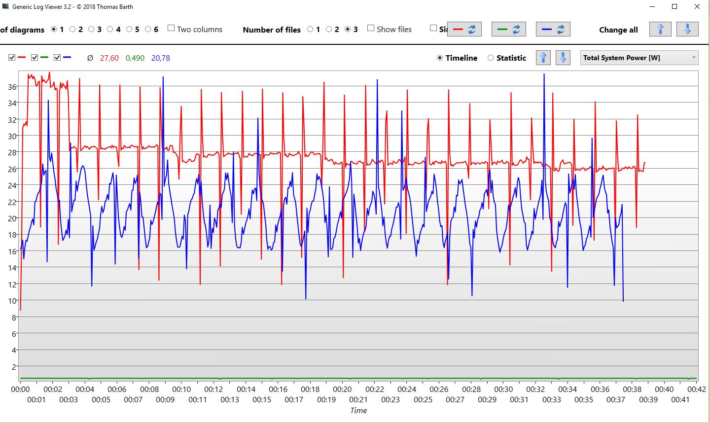 Die Total System Power zeigt die höchste Energieaufnahme bei Microsoft: bis zu 38 Watt am Anfang, was sich dann auf 27 Watt einpendelt. Lenovo pendelt sich auf 21 Watt ein. Bei HP ist uns ein Fehler bei der Messung unterlaufen (Total System Power).