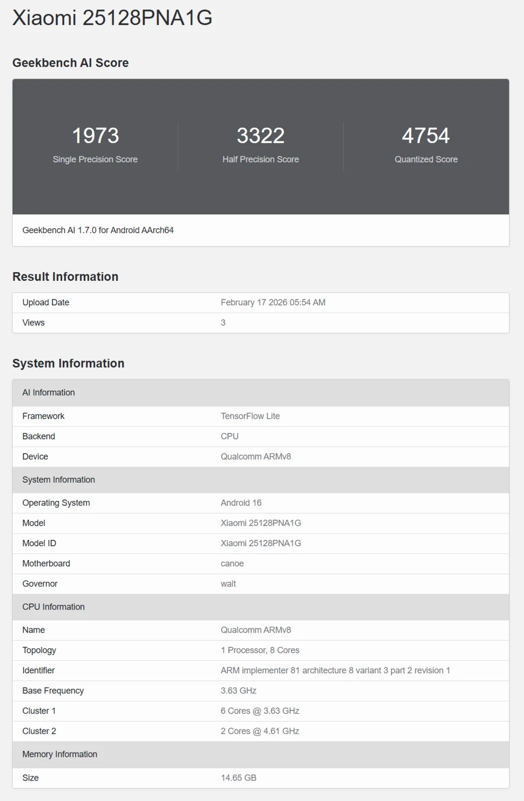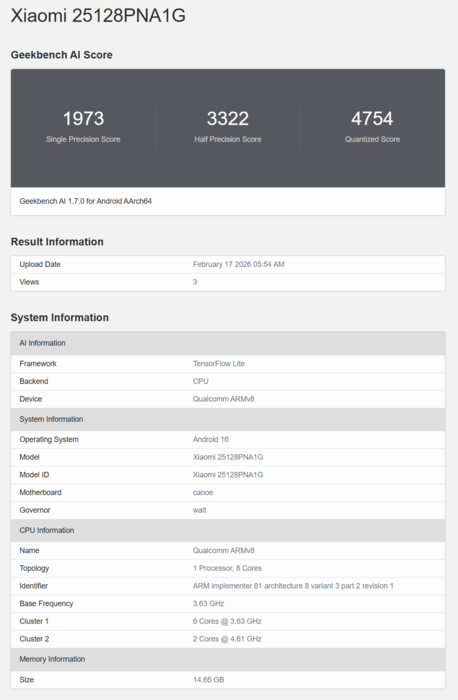 Nun hat sich die zugehörige globale Modellnummer 25128PNA1G aber erstmals auf Geekbench bemerkbar gemacht und zwar im AI-Benchmark. Wie erwartet steckt hier ebenfalls ein Snapdragon 8 Elite Gen 5 mit 16 GB RAM drin, der Benchmark-Leak ist also der jüngste Beweis für eine tatsächlich geplante globale Leica-Edition zum Xiaomi 17 Ultra. Das Preisniveau wird auf jeden Fall deutlich oberhalb von 1.500 Euro angesiedelt sein, zumal bereits das Xiaomi 17 Ultra Basismodell 1.499 Euro kosten dürfte. Wir rechnen zumindest mit 1.600, vermutlich eher 1.700 Euro.