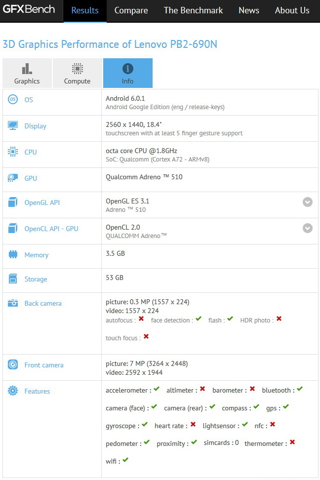 Das in der GFXBench-Datenbank gelistete Lenovo-Gerät mit der Bezeichnung PB2-690N bietet laut den Benchmark-Ergebnissen eine native Auflösung von 2.560 x 1.440 Pixeln und arbeitet offenbar mit einem Qualcomm Snapdragon 652 MSM8976 (vormals Snapdragon 620). Der Snapdragon 652 ist ein 8-Kern-Chip, der mit 4 schnellen Cortex-A72-Kernen @1,8 GHz sowie 4 sparsamen Cortex-A53-Einheiten @1,2 GHz arbeitet. Als GPU ist eine Adreno 510 integriert.