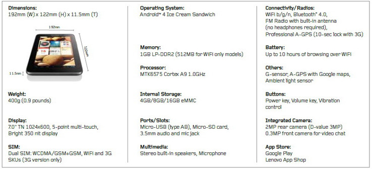 In China vermarktet Lenovo das 192 x 122 x 11,5 Millimeter messende und 400 Gramm schwere 7"-Tablet (1.024 x 600 Pixel) mit Android 4.0 Ice Cream Sandwich als LePad A2107, hierzulande kommt der Flachmann als Ideapad A2107 ab rund 200 Euro im September in den Handel. Das WLAN-Modell soll laut Lenovo USA lediglich 512 MByte RAM, das 3G-Tablet 1 GByte LPDDR2 an Bord haben.