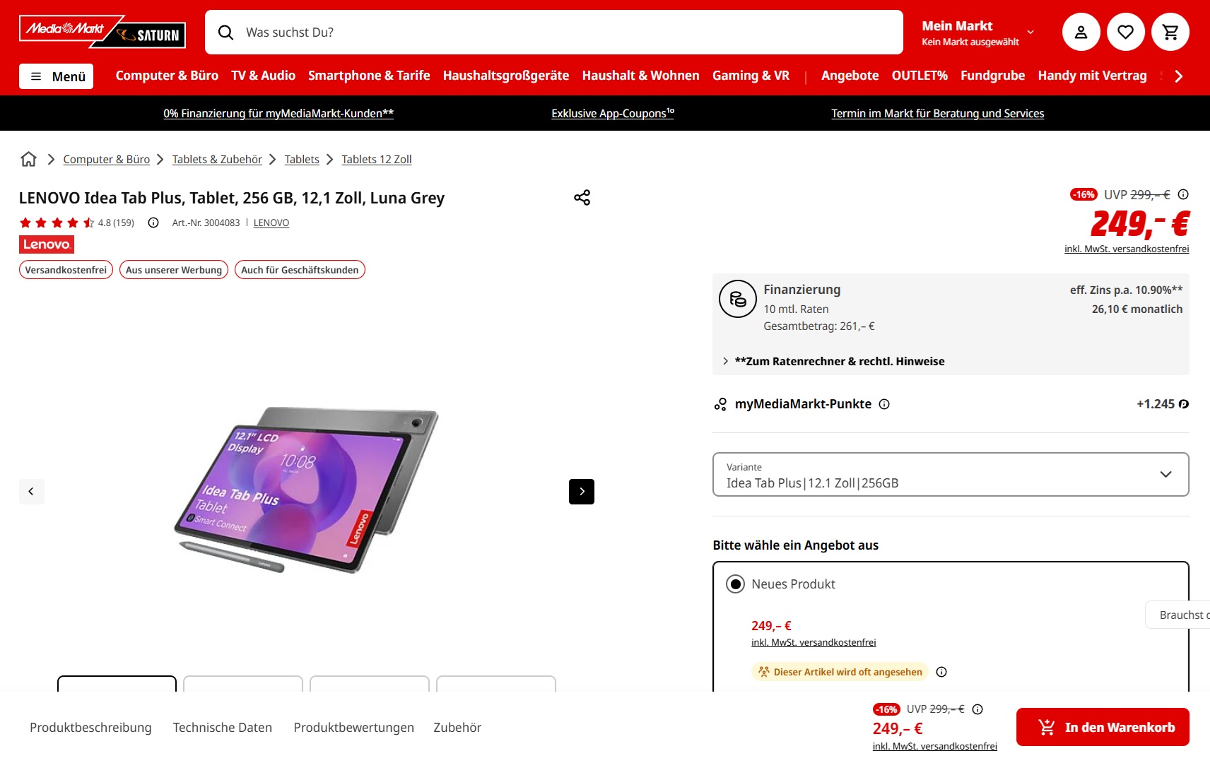 Lenovo hält mit der Idea-Tab-Plus-Reihe eine Serie von gut ausgestatteten Android-Tablets im 12.1-Zoll-Format bereit, die kein allzu großes Loch in den Geldbeutel reißen. Aktuell führen Mediamarkt.de und Saturn.de mit dem Idea Tab Plus ZAG70201SE einen Vertreter der Reihe zu einem Preis von 249 Euro im Sortiment. Das Tablet ergatterte in unserem Test die Note „Gut (79 %)“.