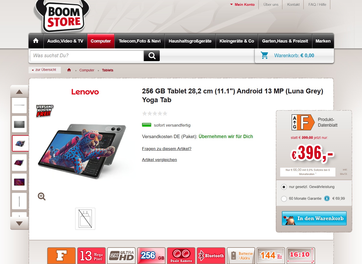 Die Yoga-Tab-Reihe der Firma Lenovo steht für gut ausgestattete, leistungsstarke Android-Tablets der Mittelklasse. Aktuell führt Boomstore.de mit dem Yoga Tab ZAG60076SE einen Abkömmling der Reihe zu einem Angebotspreis von 396 Euro im Sortiment. Mediamarkt.de und Saturn.de halten das Tablet zu einem Preis von 399 Euro bereit. Das Yoga Tab erreichte in unserem Test die Note „Sehr Gut (88 %)“.