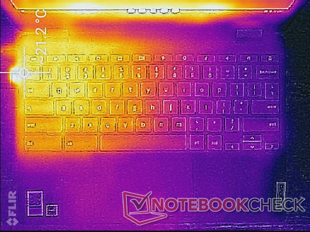 Die Oberflächentemperaturen sind in der linken Hälfte immer am wärmsten. An den oberen und unteren Hotspots können über 41 °C erreicht werden, während es beim Chromebook Spin 311 nur 31 °C sind.