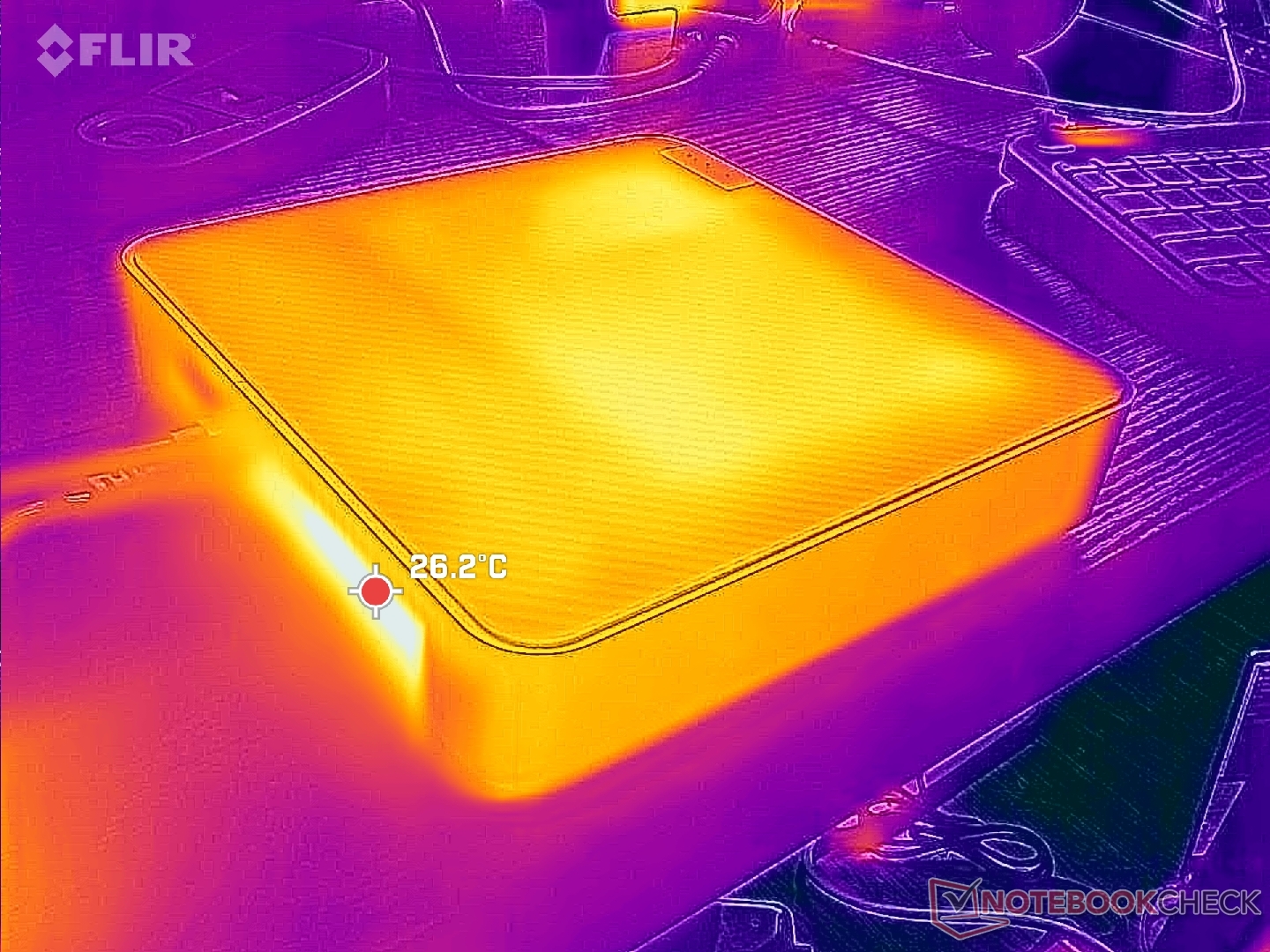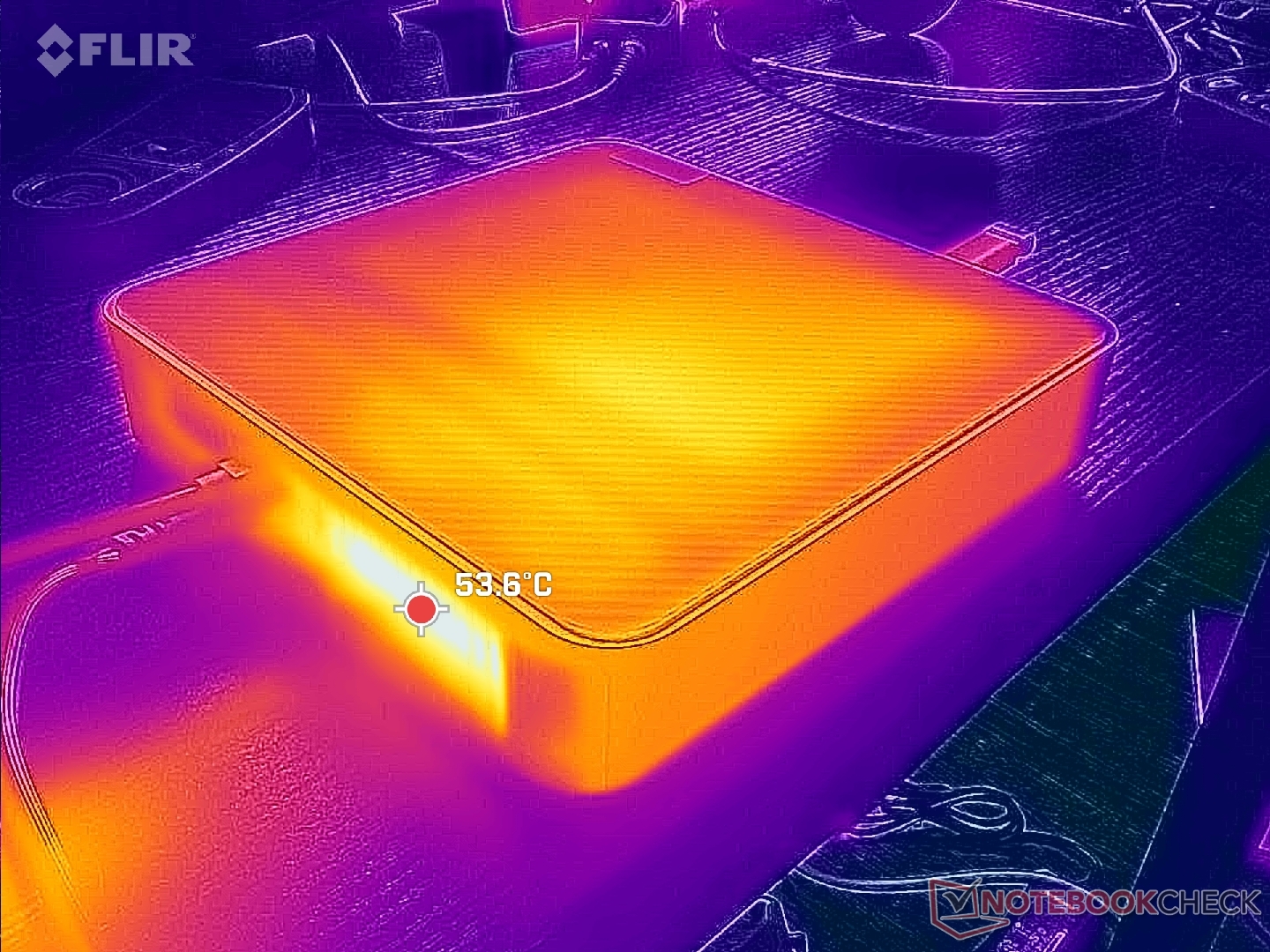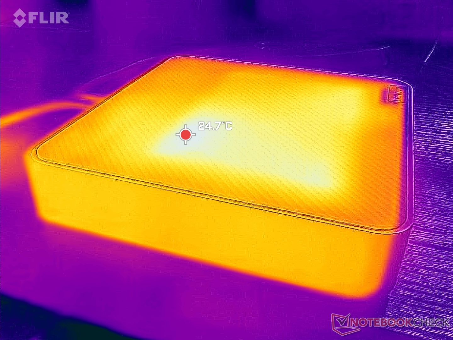 Der Hitzepunkt auf der Oberseite des Geräts kann bei längeren Betriebszeiten unter anspruchsvoller Last bis zu 40 °C erreichen, was fast 12 °C wärmer ist als das, was wir beim Beelink GTR7 gemessen haben. Die generell höheren Oberflächentemperaturen könnten auf zwei Faktoren zurückzuführen sein: das integrierte Netzteil und das fehlende Lüftungsgitter an der Oberseite, die insgesamt zu höheren Temperaturen beitragen. Im Gegensatz zu den meisten anderen Mini-PCs strömt die kühle Luft stattdessen von der Unterseite des Gerätes ein.