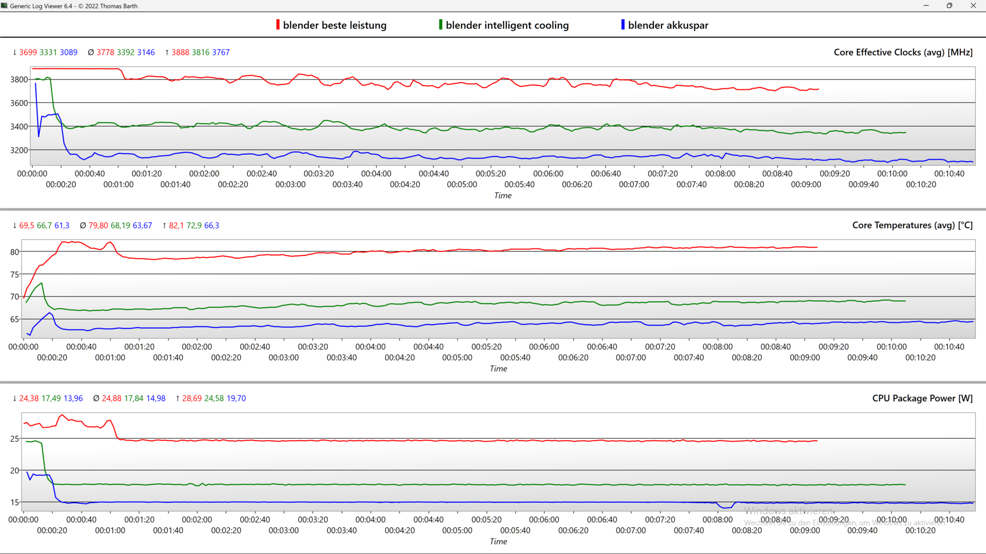 Zu Empfehlen ist das Verwenden eines der Leistungsmodi "Intelligente Kühlung" oder "Akkusparmodus", die das Gerät angenehm leise machen, während man nur wenig CPU-Leistung einbüßen muss.