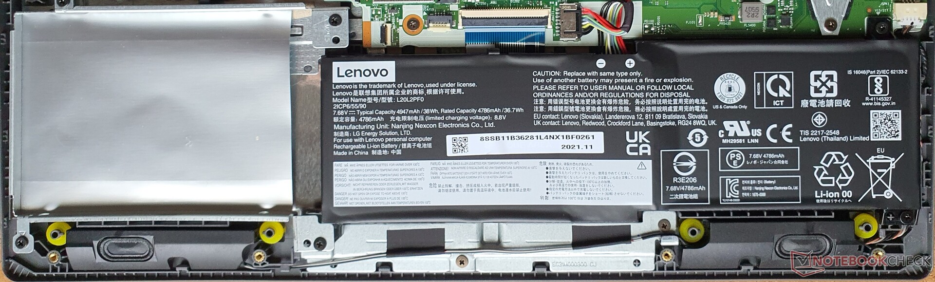 Ins Gehäuseinnere des 1,38 kg leichten Office-Laptops gelangt man sehr einfach. Tauschbar sind der verschraubte Akku, ein RAM-Modul, die PCIe-3.0-SSD (M.2 2242 oder 2280), die BIOS-Batterie und auch das Wi-Fi-6-Modul von Realtek, das durchschnittliche Geschwindigkeiten von ~900 MB/s erreicht.