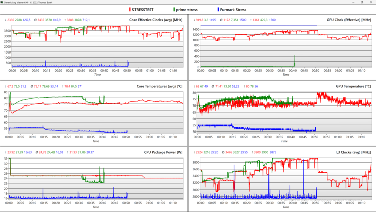 Im kombinierten Stresstest (Prime95 + FurMark) kann die CPU einen Takt von 3,4 GHz aufrechterhalten und die iGPU 1.200 MHz, was beides sehr gut ist.