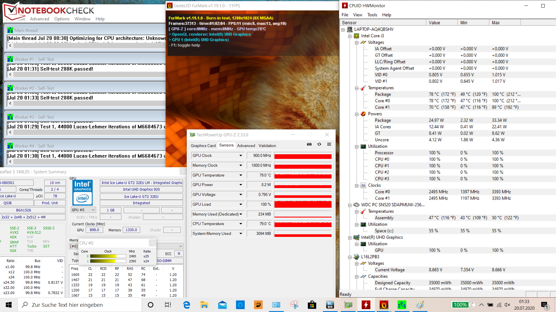 Unseren Stresstest (Prime95 und Furmark laufen für mindestens eine Stunde) durchläuft das Lenovo Notebook im Netz- und im Akkubetrieb auf die gleiche Weise. In den ersten Minuten arbeitet die CPU mit 3,2 bis 3,3 GHz. Dann sinkt der Takt auf 2,4 bis 2,6 GHz und verbleibt auf diesem Niveau. Der Grafikkern geht mit 900 MHz zu Werke. Der Stresstest stellt ein Extremszenario dar, welches so im Alltag nicht auftritt. Wir überprüfen mit diesem Test, ob das System auch bei voller Auslastung stabil läuft.
