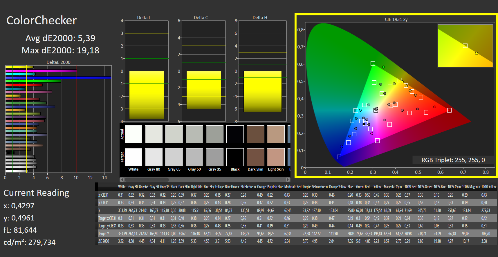 | Colorchecker dE 2000 max. * | 19.18 | 18.41 4% | 7.94 59% | 18.04 6% | 4.26 78% |