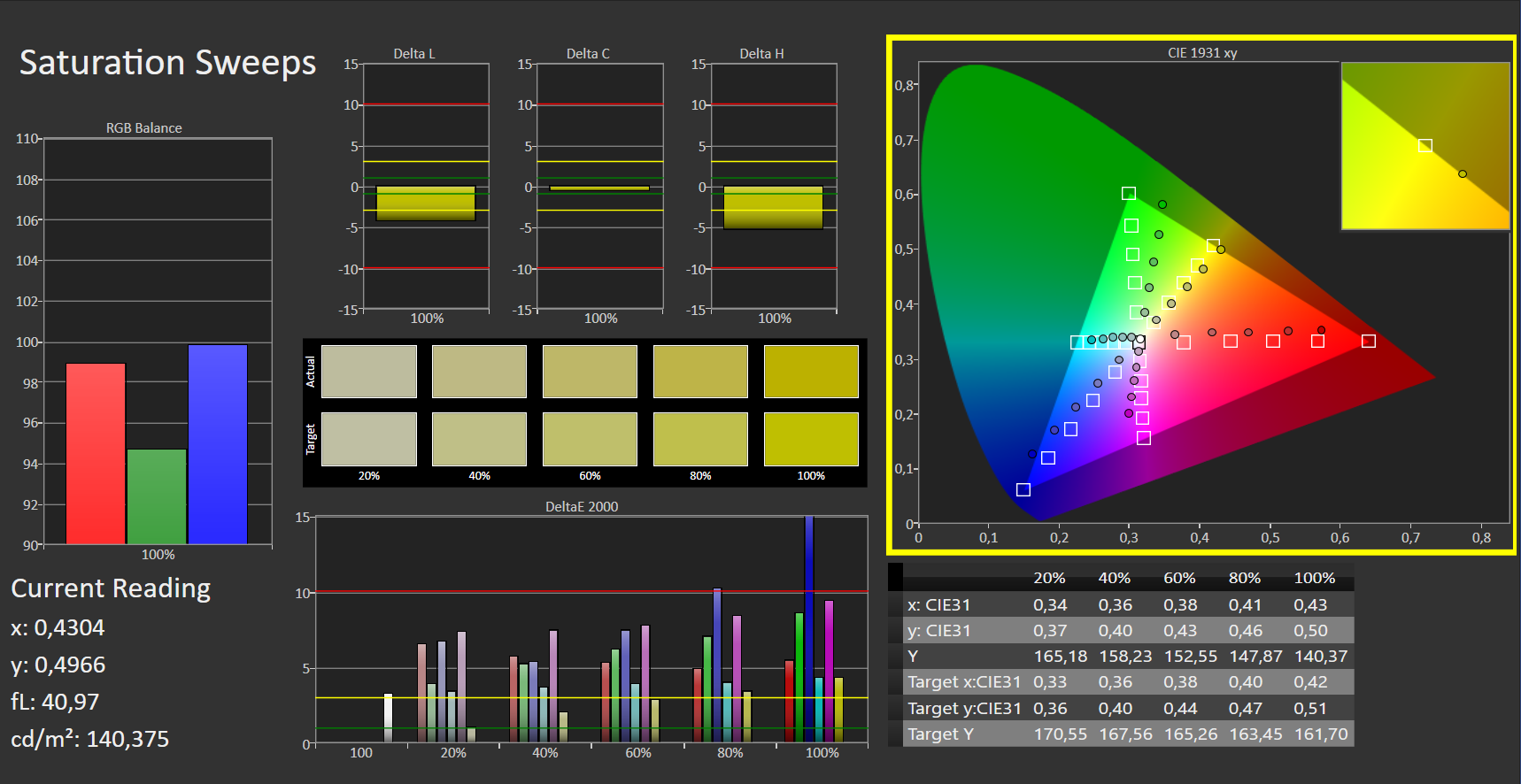 Der Bildschirm stellt die Farben im Auslieferungszustand recht passabel dar: Mit einer Abweichung von knapp 5,4 wird das Soll (DeltaE < 3) aber verfehlt. Eine Kalibrierung verbessert die Farbdarstellung nur geringfügig, sorgt aber für ausgewogenere Graustufen.
