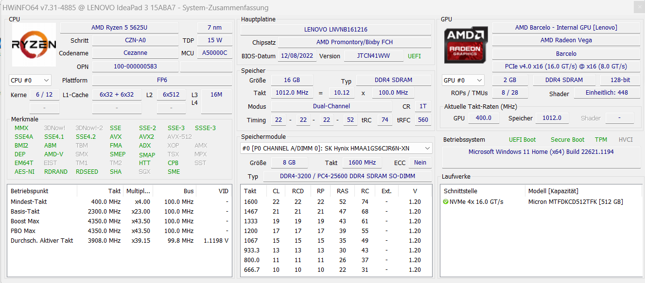 Office- und Internetanwendungen sowie genügsame Spiele bewältigt Lenovos Office-Allrounder problemlos - Ryzen-5-5625U-APU und 16 GB RAM machen es möglich. CPU und GPU können mit konstant hohen Taktraten arbeiten. Die Emissionswerte gehen in Ordnung, unter mittlerer bis voller Last dürfte die Lärmentwicklung aber geringer ausfallen.