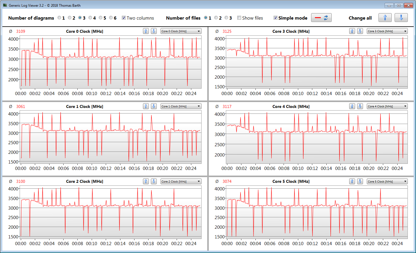 Unseren Stresstest (Prime95 und Furmark laufen für mindestens eine Stunde) bearbeiten CPU bzw. GPU mit 2,9 GHz bzw. 600 bis 1.000 MHz. Der Stresstest stellt ein Extremszenario dar, welches so im Alltag nicht auftritt. Wir überprüfen mit diesem Test, ob das System auch bei voller Auslastung stabil läuft.