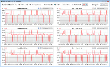 Der Multi-Thread-Test des Cinebench-R15-Benchmarks wird kurzzeitig mit 3,8 GHz bearbeitet, dann sinkt der Takt auf 3,6 GHz. Der Single-Thread-Test wird mit 1,7 bis 4 GHz durchlaufen. Im Akkubetrieb geht die CPU mit 3,5 GHz (Multi-Thread) bzw. 1,4 bis 3,4 GHz (Single-Thread) zu Werke.
