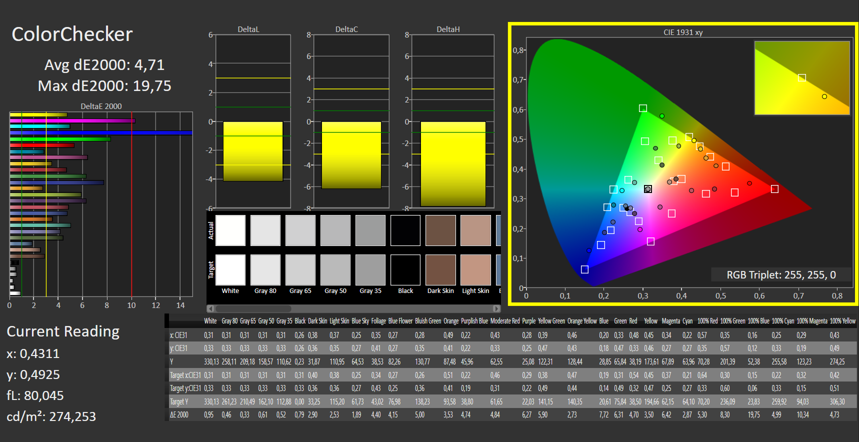 | Colorchecker dE 2000 calibrated * | 4.71 | 4.76 -1% | 0.8 83% | 2.58 45% | ||