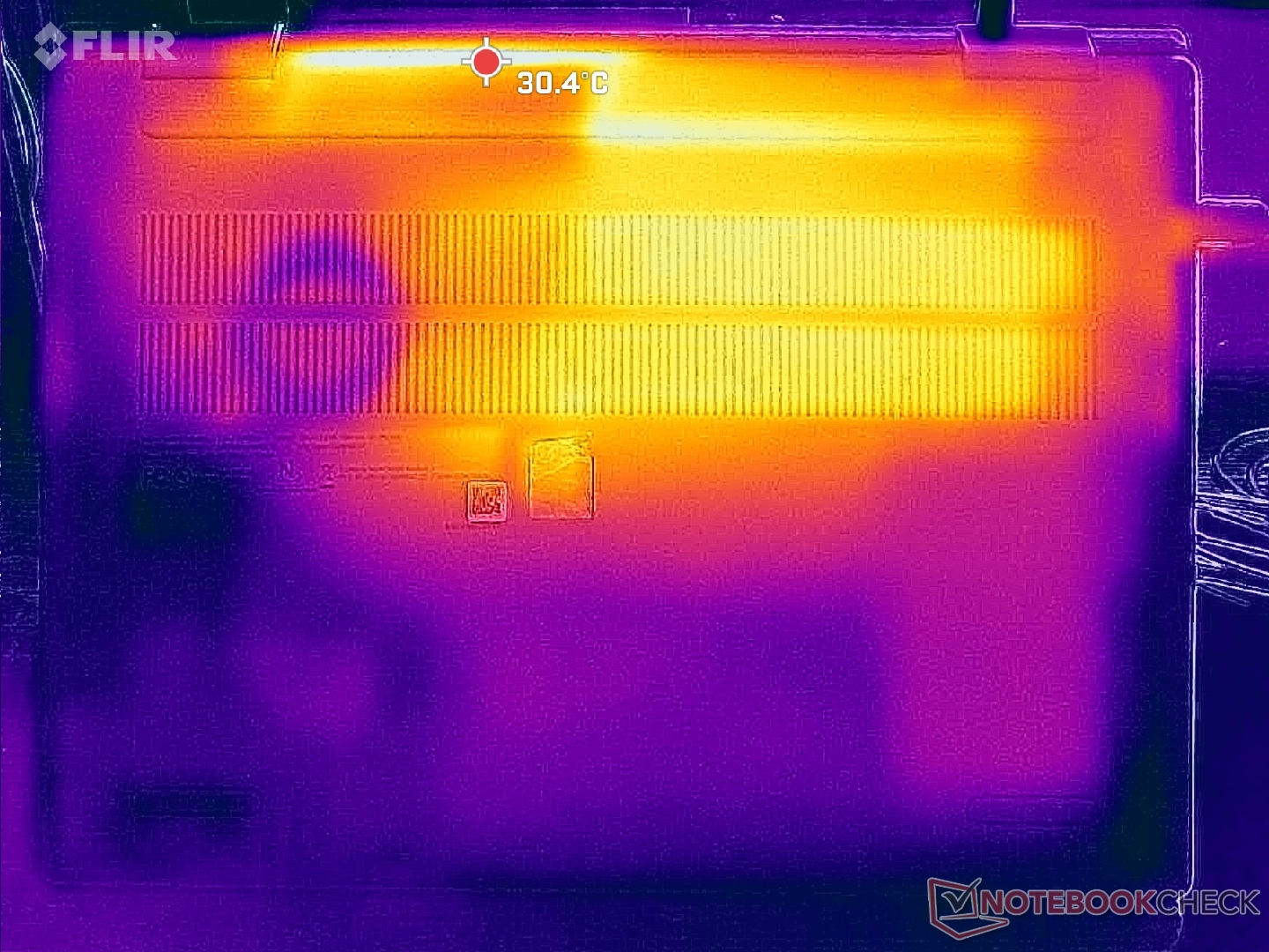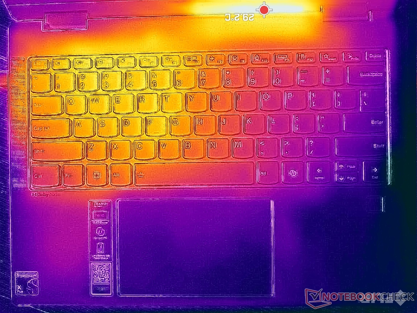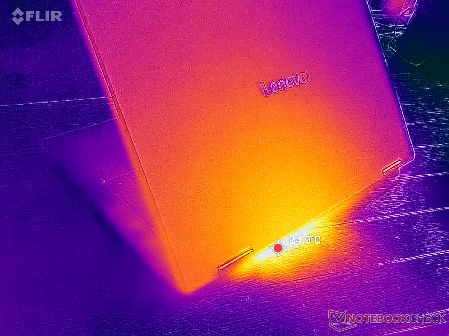 Die Oberflächentemperaturen sind auf der linken Hälfte des Gehäuses wärmer als auf der rechten. Dennoch sind die Hotspots mit nur 35 bzw. 33 °C auf dem Tastaturdeck und der Unterseite nicht sehr warm oder unangenehm, was sich mit unseren Stresstest-Ergebnissen oben deckt. Die meisten anderen 14-Zoll-Notebooks können viel wärmer werden, wie z. B. das AMD betriebene ThinkPad T14s Gen 6, das unter ähnlichen Bedingungen über 46 °C erreichen kann. Natürlich bieten diese Optionen in der Regel auch eine viel schnellere Leistung als unser Snapdragon.