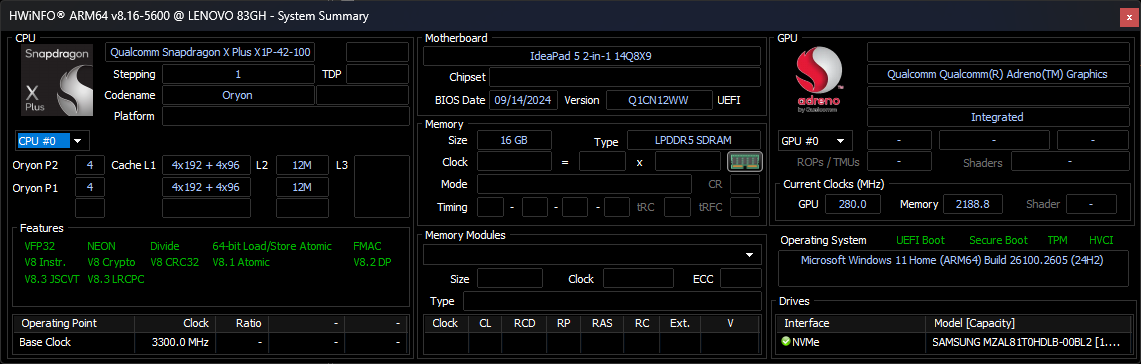 | Lenovo IdeaPad 5 2-in-1 14Q8X9 Qualcomm Snapdragon X Plus X1P-42-100 ⎘ Qualcomm SD X Adreno X1-45 1.7 TFLOPS ⎘ 16 GB RAM, 1024 GB SSD | Amazon: 921,73 € Geizhals Suche | 1.5 kg | 17.5 mm | 14.00" 1920x1200 162 PPI OLED | |