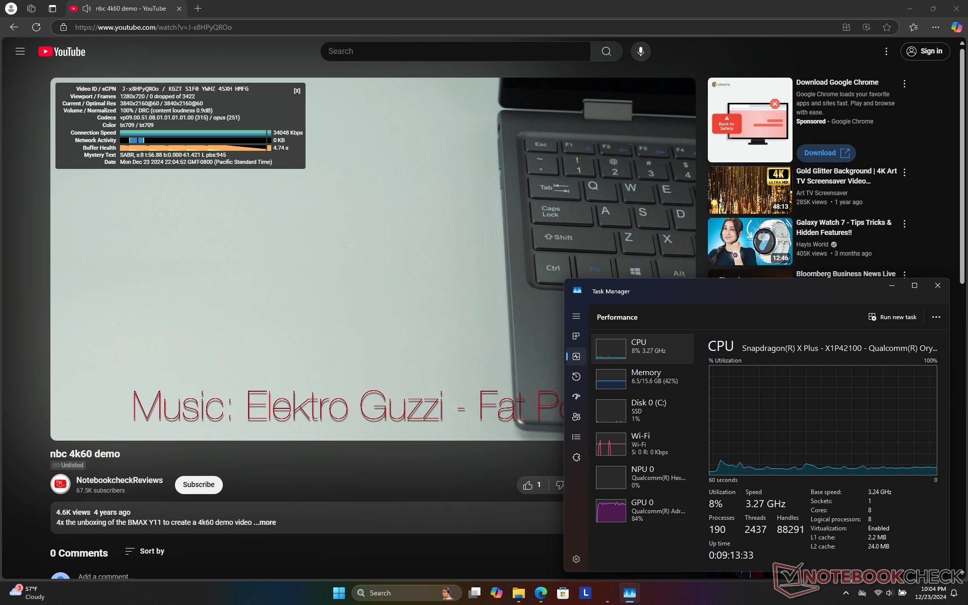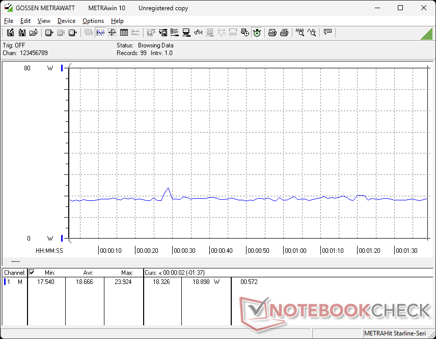 Der Leerlauf auf dem Desktop erfordert je nach Helligkeitsstufe zwischen 3 und 11 W. Da es sich um ein OLED-Panel handelt, kann der obere Bereich relativ hoch sein, vor allem wenn überwiegend weiße Farben angezeigt werden. Ansonsten ist der Verbrauch bei anspruchsvollen Anwendungen spürbar niedriger als bei den Alternativen von Intel und AMD. Cyberpunk 2077 zum Beispiel verbraucht im Durchschnitt nur 21 W im Vergleich zu 2x soviel auf dem ThinkPad T14s Gen 6 oder MacBook Pro 14 M4. Natürlich bieten diese Alternativen auch eine deutlich schnellere Grafikleistung, so dass die Leistung pro Watt bei GPU-intensiven Szenarien nicht unbedingt zugunsten von Qualcomm ausfällt.