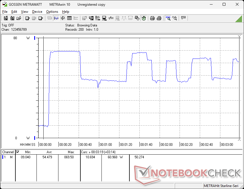 Wenn man CPU-lastige Aufgaben wie Prime95 ausführt, steigt der Verbrauch auf 69 W, bevor er aufgrund von thermischen Beschränkungen kontinuierlich auf bis zu 21 W fällt. Das ist wiederum deutlich weniger anspruchsvoll als der Core Ultra 7 155U im Lenovo ThinkPad E14 G6, aber die Intel Option ist bei den meisten Anwendungen dennoch im Vorteil.