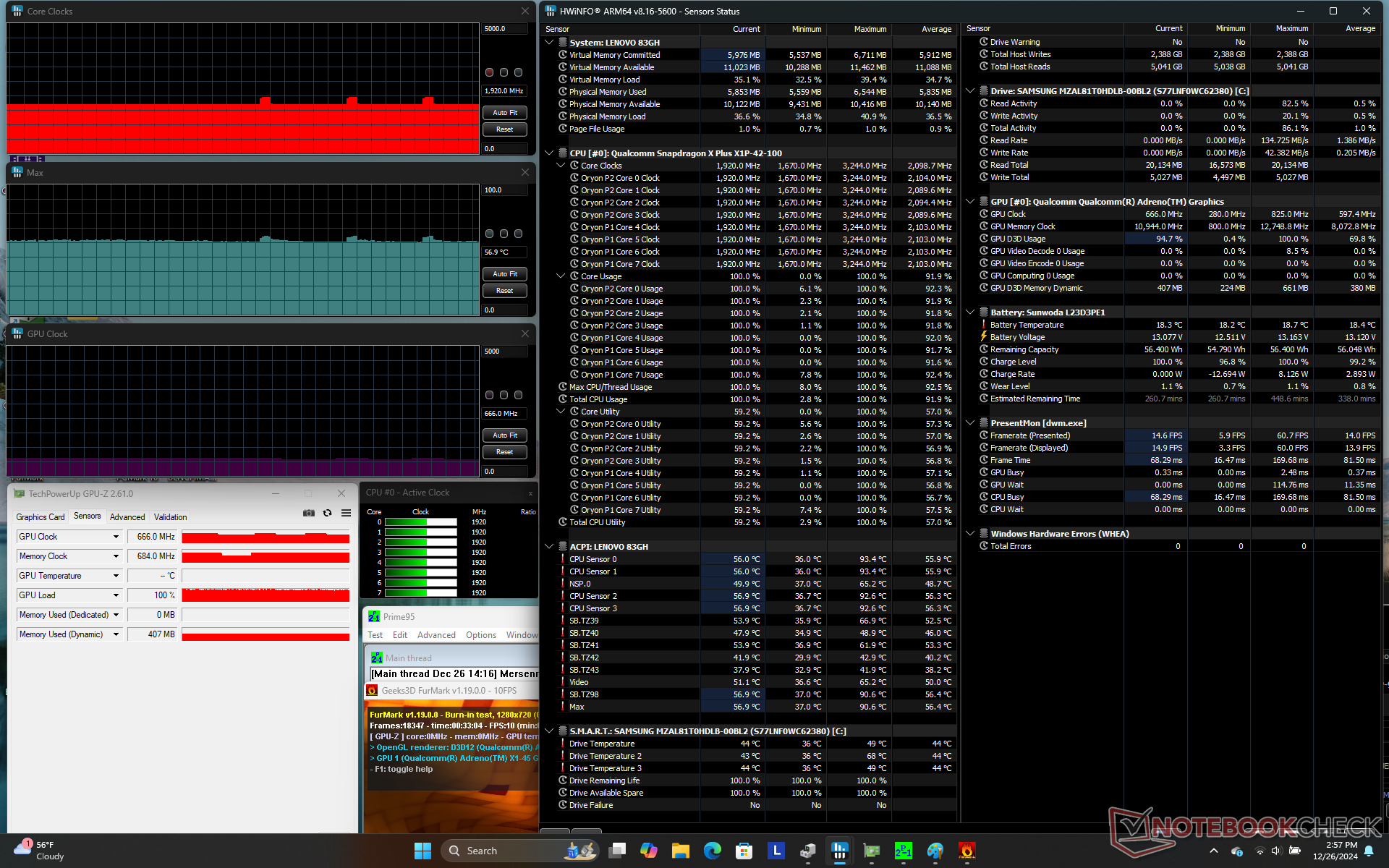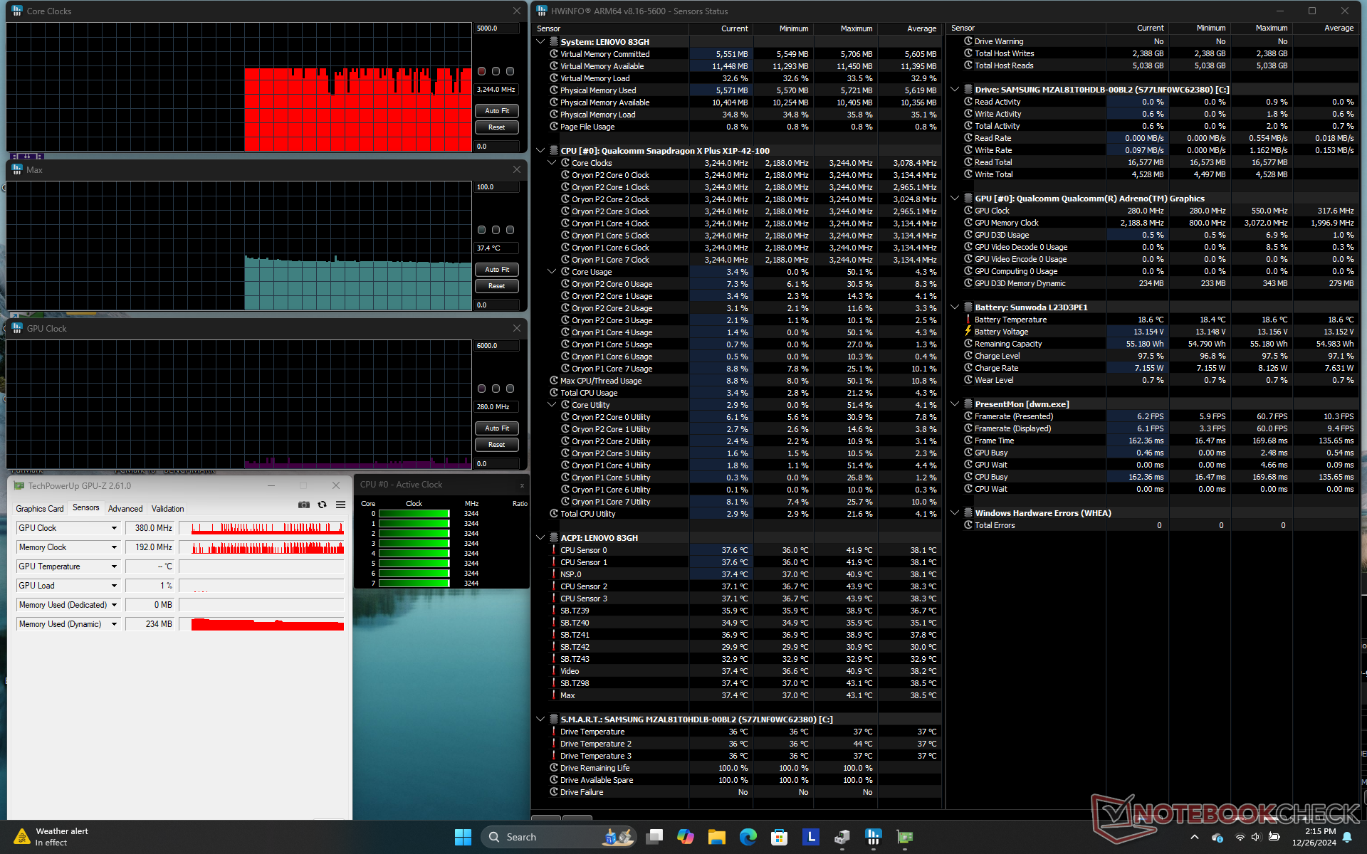 Die Akkulaufzeit ist nach wie vor eines der größten Highlights, wenn man einen Snapdragon basierten PC statt eines herkömmlichen AMD- oder Intel PCs besitzt. Wir konnten eine WLAN-Laufzeit von etwas mehr als 16 Stunden mit dem anständig dimensionierten internen 57-Wh-Akku verzeichnen, verglichen mit "nur" 9,5 Stunden bei dem ThinkPad E14 G6, das mit dem älteren Core Ultra 7 155U läuft. Neuere Laptops mit Lunar Lake, wie zum Beispiel das Asus Zenbook S 14, liegen selbst mit ihrem größeren 72-Wh-Akku immer noch ein paar Stunden hinter unserem Lenovo zurück.