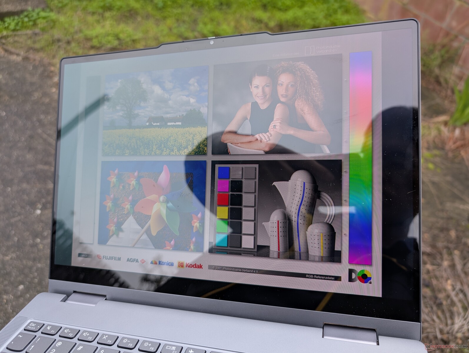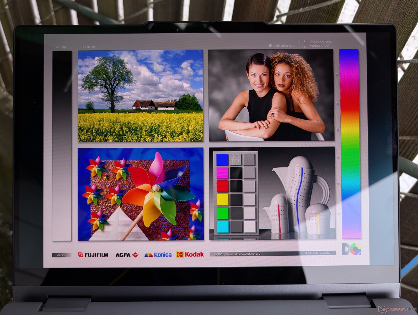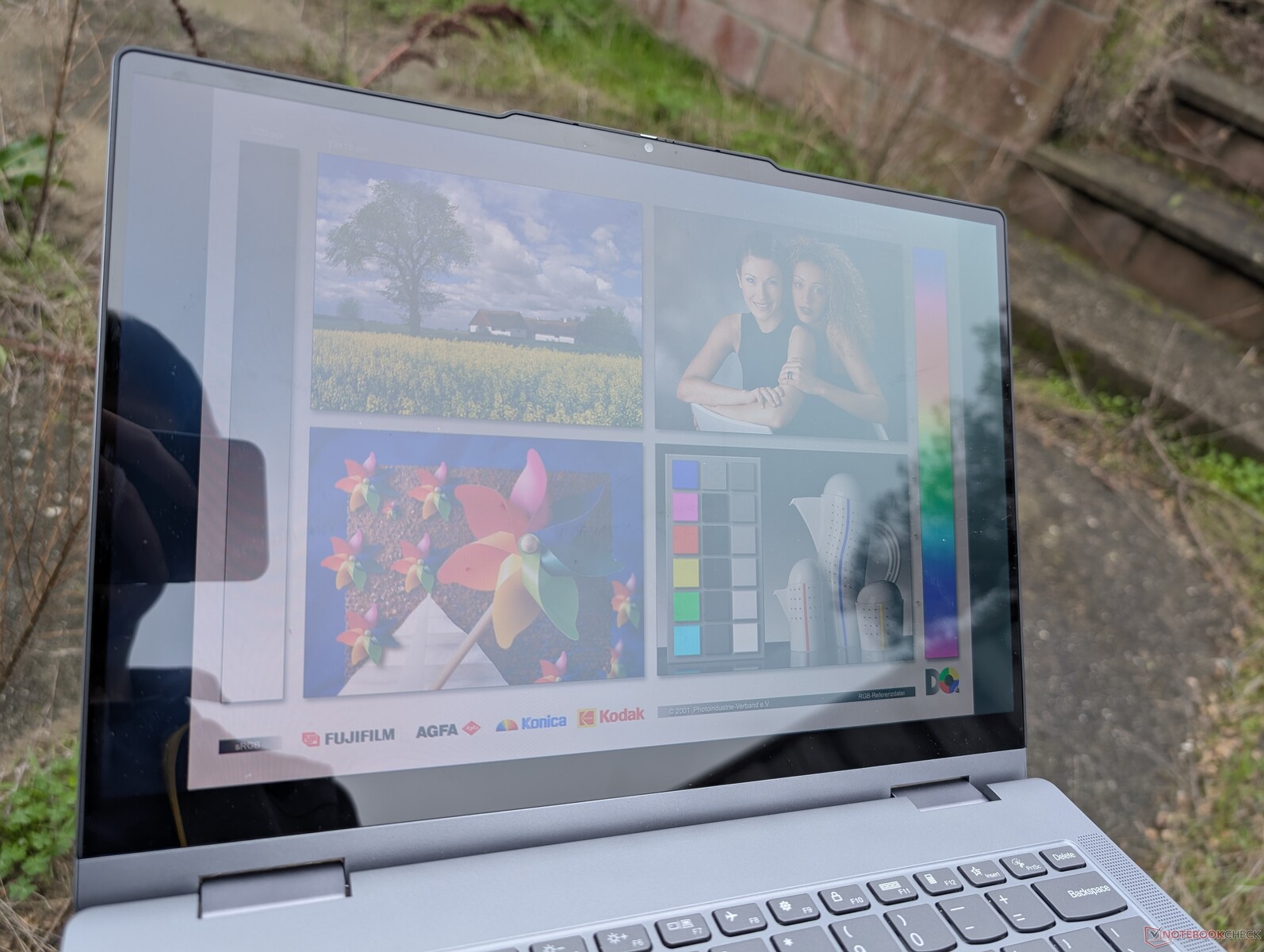 Es ist schön zu sehen, dass OLED standardmäßig zu einem so günstigen Preis angeboten wird in einem Convertible. Leider zeigt sich bei näherer Betrachtung der Spezifikationen, dass diesem speziellen Panel eine Menge Funktionen fehlen, die die meisten modernen OLED-Panels bieten. Erstens ist unser Panel auf eine Bildwiederholfrequenz von nur 60 Hz statt der wünschenswerteren 90 oder 120 Hz beschränkt. Zweitens beträgt die native Auflösung nur 1.200p, was angesichts der Bildschirmgröße von 14 Zoll zwar akzeptabel ist, aber nicht annähernd so scharf wie viele andere 14-Zoll-Modelle wie das Galaxy Book4 Edge 14. Und schließlich ist die Helligkeit nicht hoch genug, um HDR-Funktionen zu unterstützen. Diese entscheidenden Nachteile sind typisch für ein preiswertes OLED-Panel. Natürlich kann man dennoch von den OLED-Vorteilen gegenüber IPS profitieren, wie z. B. minimales Ghosting und lebendigere P3-Farben.