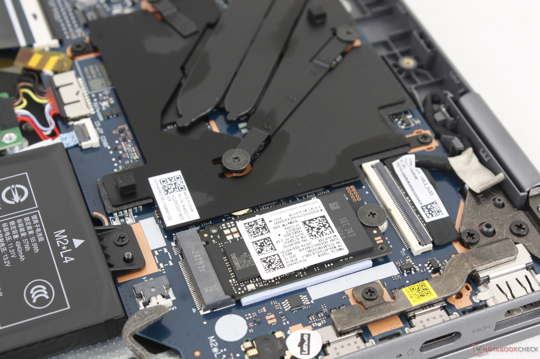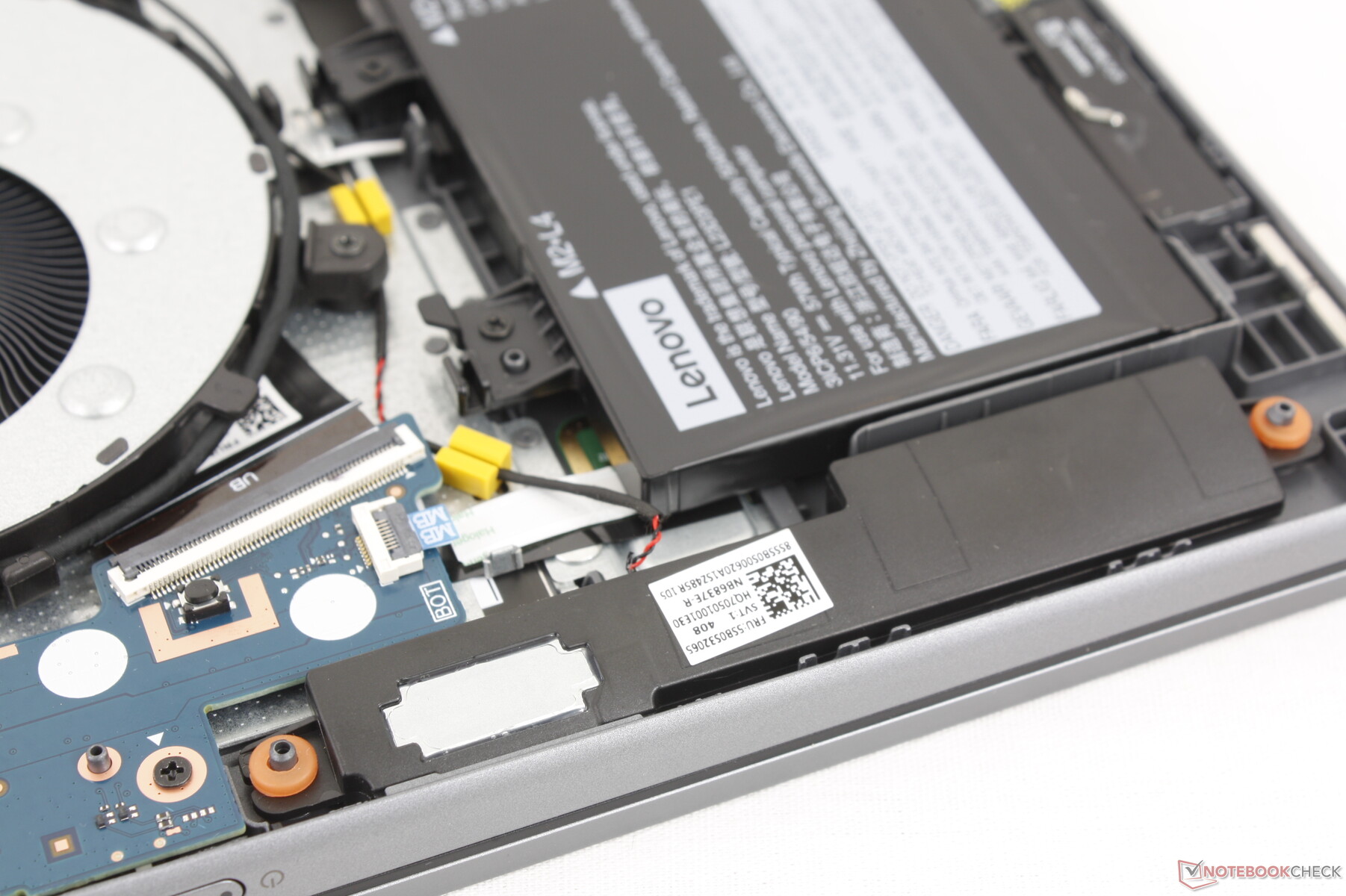 Die Unterseite ist mit nur vier T5-Torx-Schrauben befestigt, was die Wartung sehr erleichtert. Leider gibt es im Inneren nicht viel zum Aufrüsten, da die RAM-Module fest verlötet sind und es keine Unterstützung für sekundäre SSDs gibt. Das WLAN-Modul ist ebenfalls fest verlötet, anders als bei den Intel- oder AMD Versionen des IdeaPad 5 2-in-1 14.