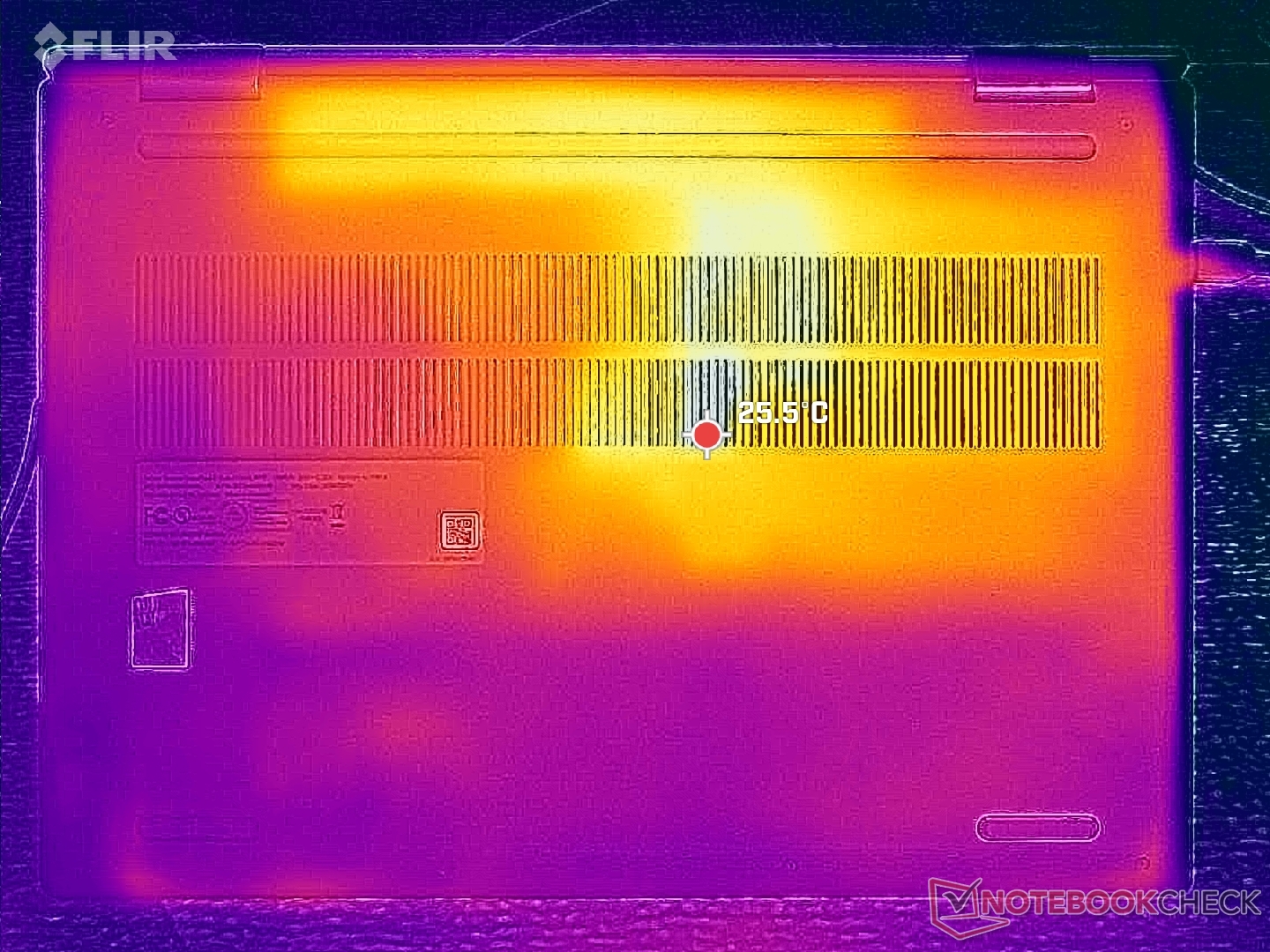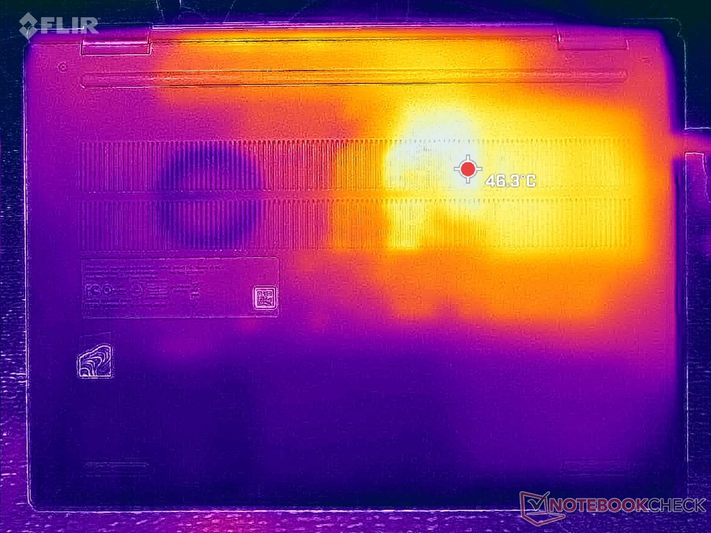 (±) Auf der Unterseite messen wir eine maximalen Wert von 43.2 °C (im Vergleich zum Durchschnitt von 36.8 °C).
