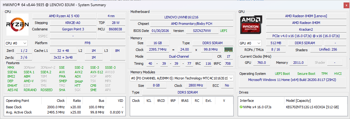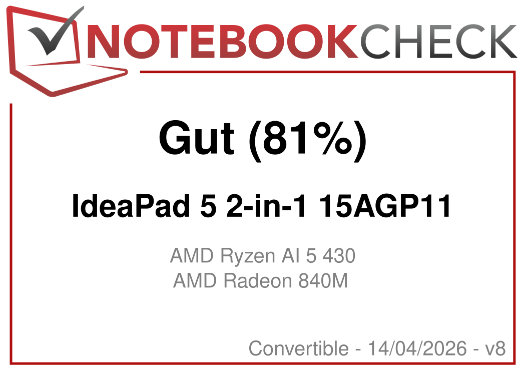 | Lenovo IdeaPad 5 2-in-1 15AGP11 AMD Ryzen AI 5 430 ⎘ AMD Radeon 840M ⎘ 16 GB RAM | Amazon: 728,56 € Bestpreis 1199.01€ Lenovo | 1.8 kg | 17.6 mm | 15.30" 1920x1200 148 PPI IPS | |