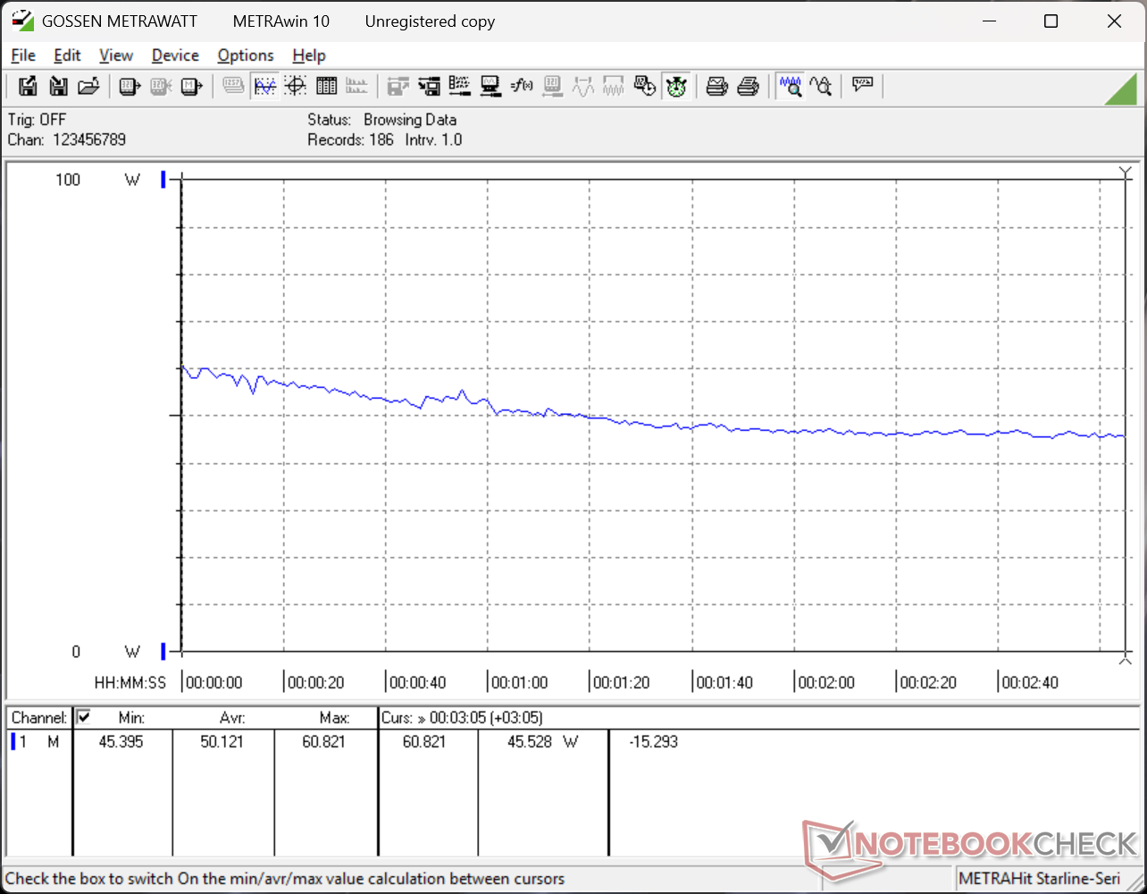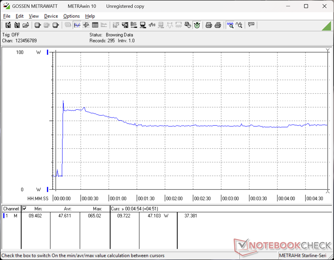 Das System kann die gesamte Leistung von 65 W des kleinen (9 x 4,6 x 2,7 cm) USB-C-Netzteils aufnehmen, wenn die CPU voll ausgelastet ist, aber das ist nur vorübergehend, wie die Grafik unten zeigt.